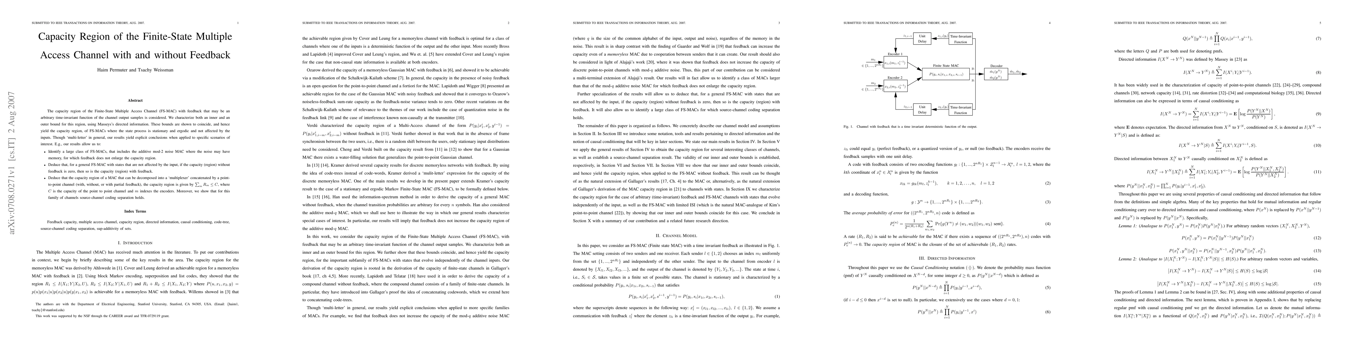 This paper characterizes the capacity region of the Finite-State Multiple Access Channel (FS-MAC) with feedback, proving that feedback does not enlarge the capacity region for certain classes, including those with memory in additive mod-2 noise. It also establishes that if the capacity without feedback is zero, it remains zero with feedback, and provides a formula for the capacity region of concatenated MAC channels.