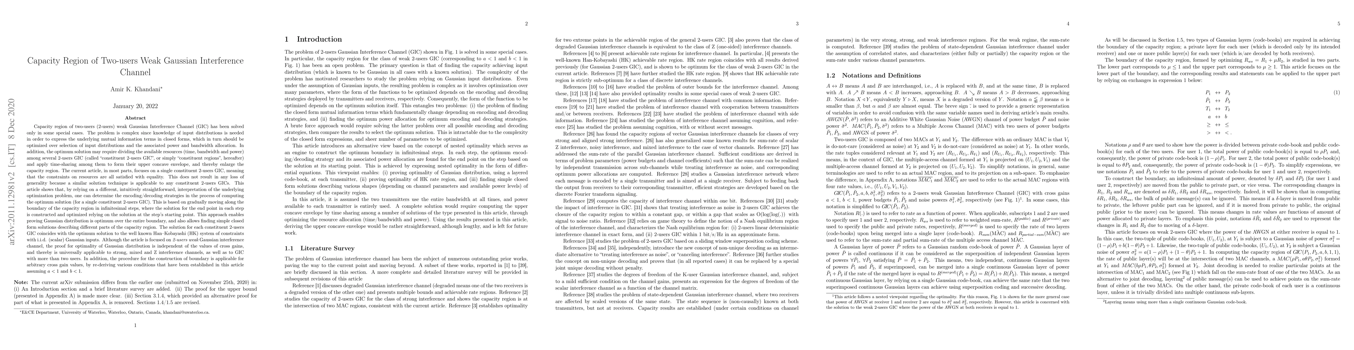 Computing capacity of Gaussian Interference Channel (GIC) is complex since knowledge of input distributions is needed to find the mutual information terms in closed forms, which should be optimized over input distributions and associated resource allocation. The optimum solution may require dividing the available resources among several GIC (each called a "constituent region", hereafter) and apply time-sharing among them. The current article focuses on a single constituent region (meaning the constraints on resources are all satisfied with equality) for a 2-users weak GIC. It is shown that, by relying on a different, intuitively straightforward, interpretation of the underlying optimization problem, one can determine the encoding/decoding strategies in the process of computing the optimum solution. This is based on gradually moving along the boundary of the capacity region in infinitesimal steps, where the solution for the end point in each step is optimized relying on the solution at the step's starting point. This approach enables proving Gaussian distribution is optimum over the entire boundary, and also allows finding simple closed form solutions describing different parts of the capacity region. The solution for each constituent 2-users GIC coincides with the optimum solution to the Han Kobayashi (HK) system of constraints with i.i.d. (scalar) Gaussian inputs. Although the article is focused on 2-users weak GIC, the proof for optimality of Gaussian distribution is independent of the values of cross gains, and thereby is universally applicable to strong, mixed and Z interference channels, as well as to GIC with more than two users. In addition, the procedure for the construction of boundary is applicable for arbitrary cross gain values, by re-deriving various conditions that have been established assuming cross gains being less than one.