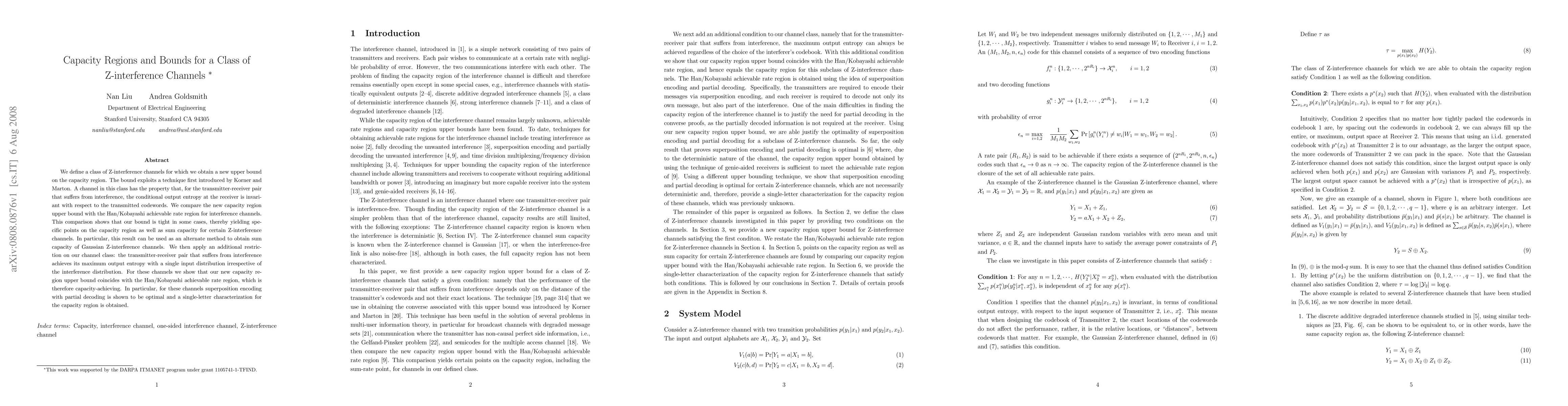 We define a class of Z-interference channels for which we obtain a new upper bound on the capacity region. The bound exploits a technique first introduced by Korner and Marton. A channel in this class has the property that, for the transmitter-receiver pair that suffers from interference, the conditional output entropy at the receiver is invariant with respect to the transmitted codewords. We compare the new capacity region upper bound with the Han/Kobayashi achievable rate region for interference channels. This comparison shows that our bound is tight in some cases, thereby yielding specific points on the capacity region as well as sum capacity for certain Z-interference channels. In particular, this result can be used as an alternate method to obtain sum capacity of Gaussian Z-interference channels. We then apply an additional restriction on our channel class: the transmitter-receiver pair that suffers from interference achieves its maximum output entropy with a single input distribution irrespective of the interference distribution. For these channels we show that our new capacity region upper bound coincides with the Han/Kobayashi achievable rate region, which is therefore capacity-achieving. In particular, for these channels superposition encoding with partial decoding is shown to be optimal and a single-letter characterization for the capacity region is obtained.