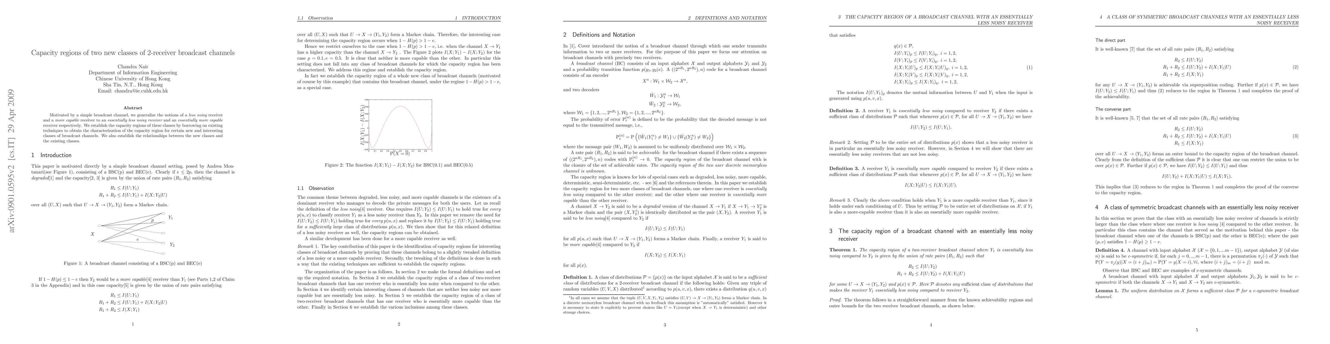 Motivated by a simple broadcast channel, we generalize the notions of a less noisy receiver and a more capable receiver to an essentially less noisy receiver and an essentially more capable receiver respectively. We establish the capacity regions of these classes by borrowing on existing techniques to obtain the characterization of the capacity region for certain new and interesting classes of broadcast channels. We also establish the relationships between the new classes and the existing classes.