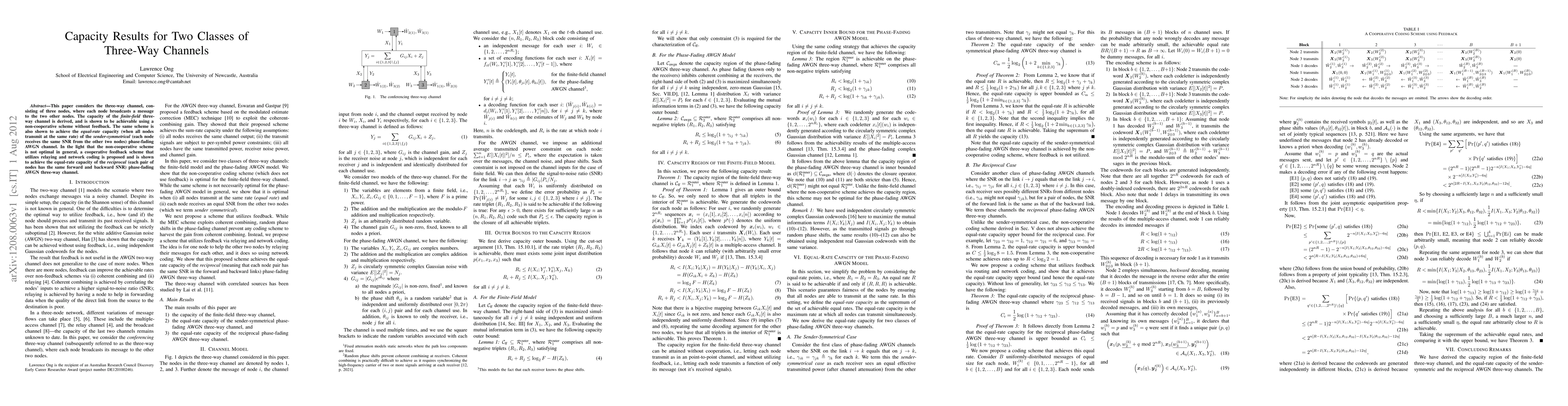 A new scheme achieves capacity for three-way channels without feedback, and an improved scheme with feedback achieves optimal capacity for specific types of phase-fading AWGN channels.