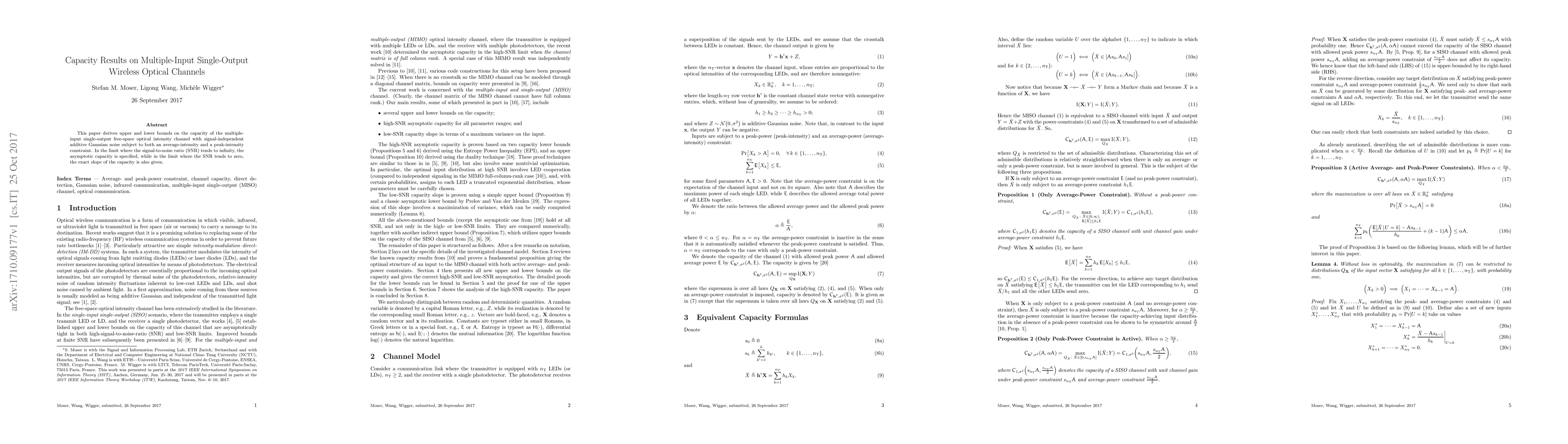 This paper establishes upper and lower bounds for the capacity of multiple-input single-output wireless optical channels under additive Gaussian noise, considering both average and peak intensity constraints. It specifies the asymptotic capacity in high SNR and the exact capacity slope in low SNR scenarios.