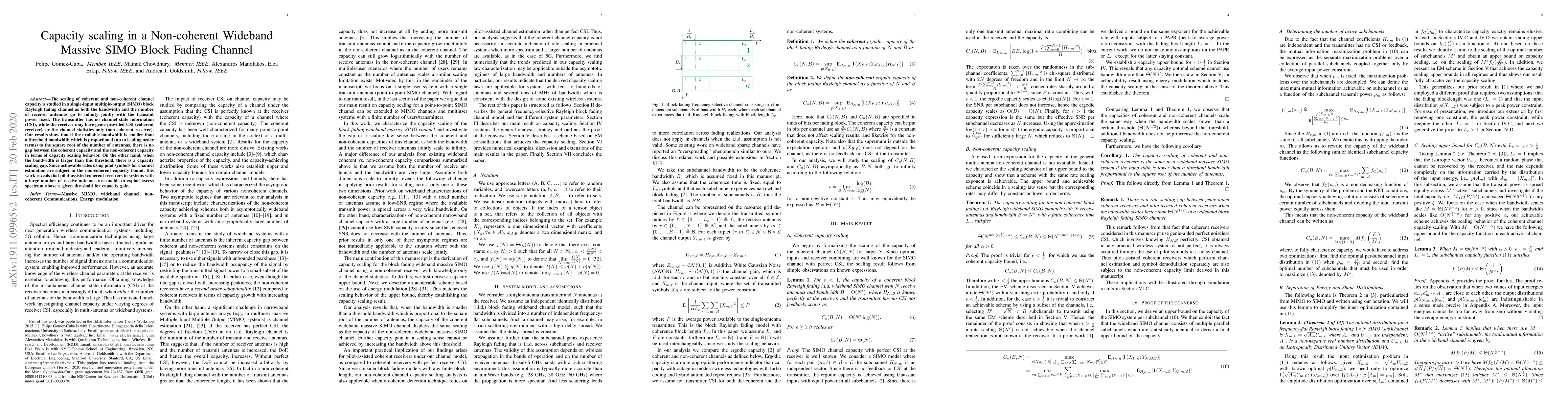This paper investigates the capacity scaling in a non-coherent wideband massive SIMO block fading channel, showing that below a threshold bandwidth proportional to the square root of the number of antennas, coherent and non-coherent capacities scale similarly. Above this threshold, a capacity scaling gap emerges, indicating that pilot-assisted coherent receivers cannot fully utilize wider bandwidths for capacity gain.