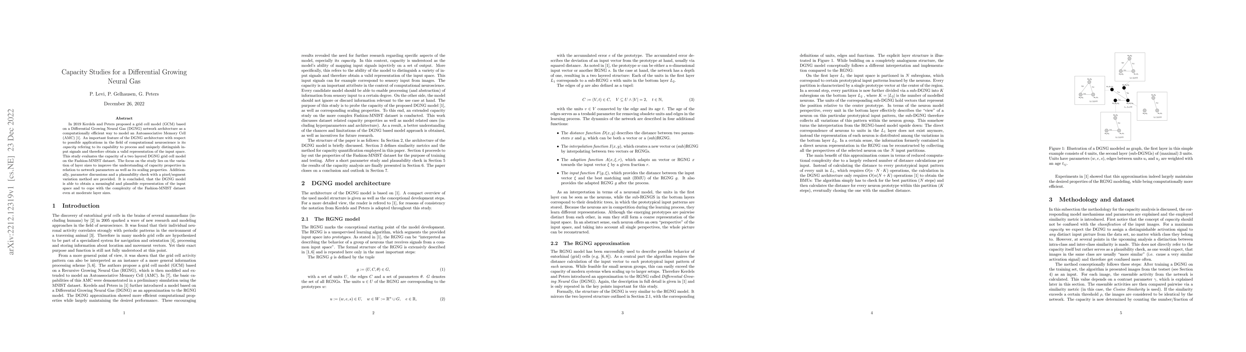 In 2019 Kerdels and Peters proposed a grid cell model (GCM) based on a Differential Growing Neural Gas (DGNG) network architecture as a computationally efficient way to model an Autoassociative Memory Cell (AMC) \cite{Kerdels_Peters_2019}. An important feature of the DGNG architecture with respect to possible applications in the field of computational neuroscience is its \textit{capacity} refering to its capability to process and uniquely distinguish input signals and therefore obtain a valid representation of the input space. This study evaluates the capacity of a two layered DGNG grid cell model on the Fashion-MNIST dataset. The focus on the study lies on the variation of layer sizes to improve the understanding of capacity properties in relation to network parameters as well as its scaling properties. Additionally, parameter discussions and a plausability check with a pixel/segment variation method are provided. It is concluded, that the DGNG model is able to obtain a meaningful and plausible representation of the input space and to cope with the complexity of the Fashion-MNIST dataset even at moderate layer sizes.
