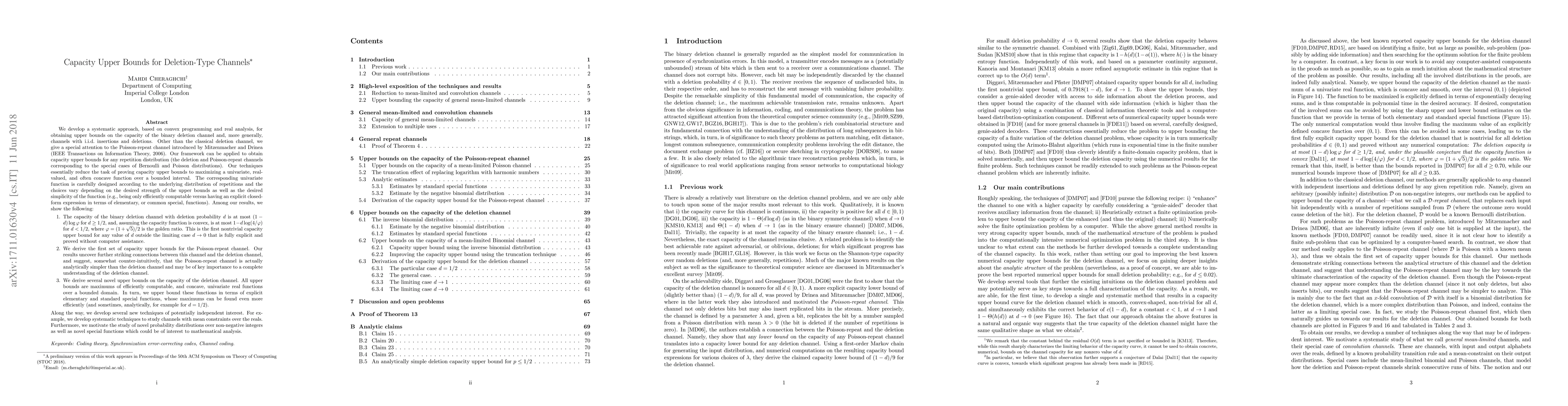 This paper develops a systematic convex programming approach to derive upper bounds on the capacity of deletion-type channels, including the binary deletion and Poisson-repeat channels. The authors provide explicit, nontrivial upper bounds for the binary deletion channel and introduce novel upper bounds for the Poisson-repeat channel, all derived through efficient, computable, and concave functions.