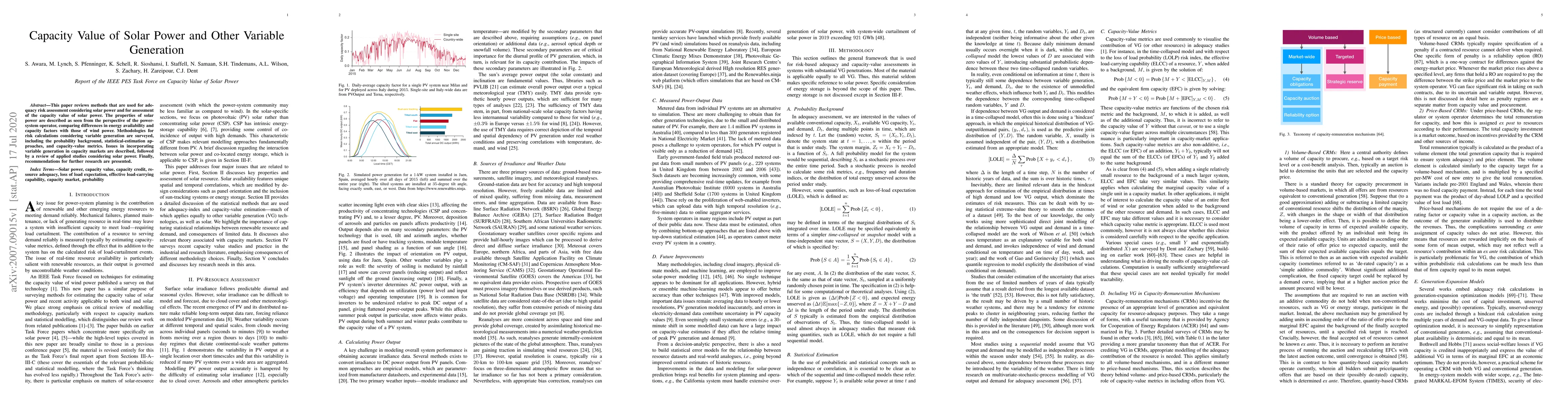 This paper reviews methods for assessing the adequacy risk and capacity value of solar power, comparing it to wind power, and surveys methodologies for integrating variable generation into capacity markets, concluding with recommendations for further research.