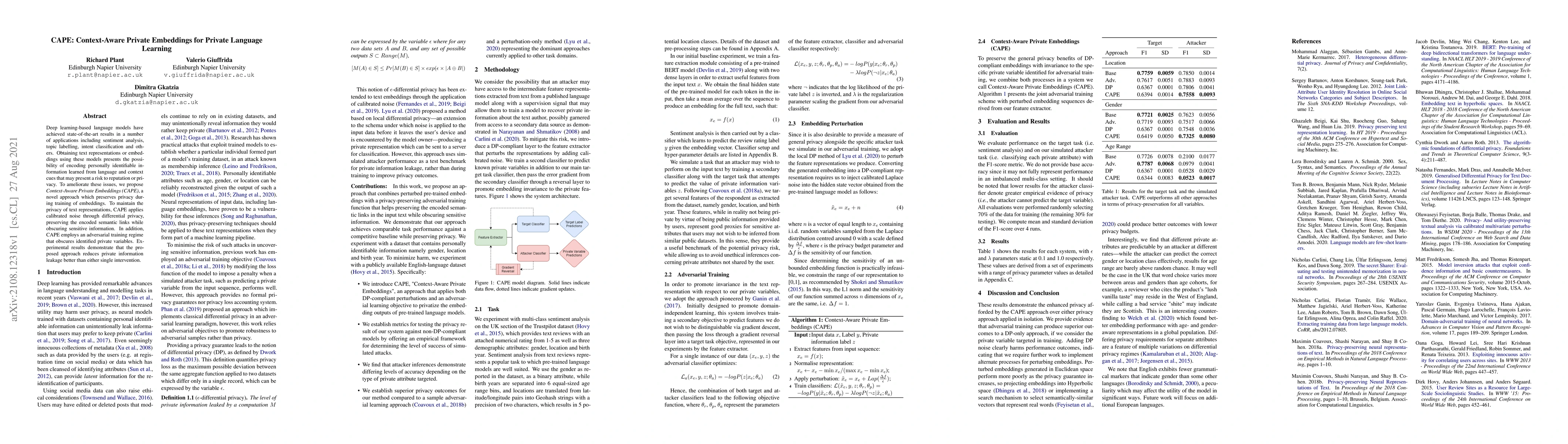 Title: CAPE: Context-Aware Private Embeddings for Private Language Learning Summary: CAPE proposes a novel method to train language embeddings while preserving privacy through differential privacy and adversarial training, thereby reducing leakage of personally identifiable information compared to single interventions.