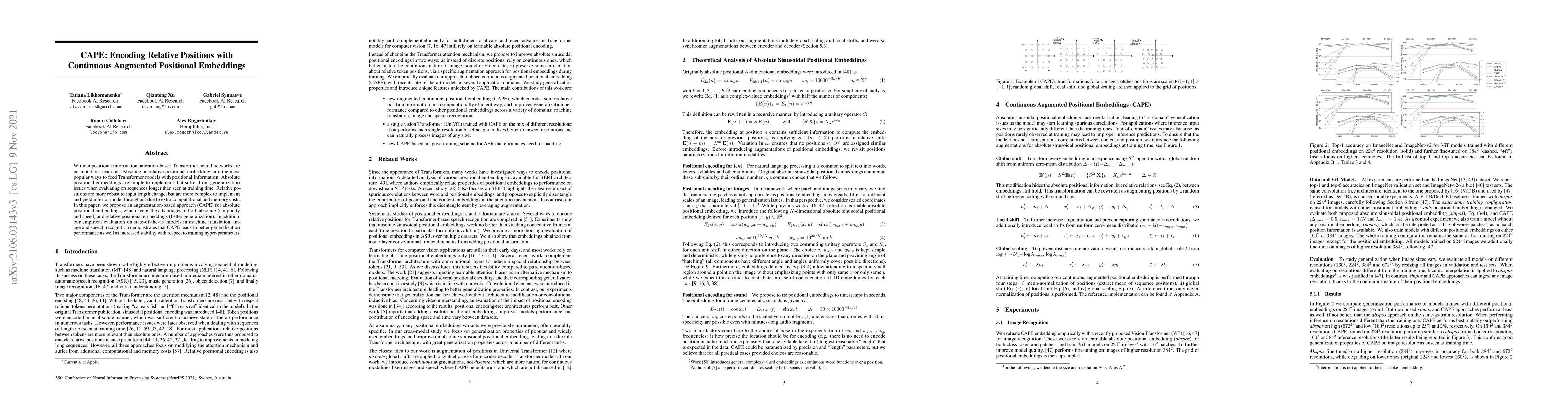 Title: CAPE: Encoding Relative Positions with Continuous Augmented Positional Embeddings Summary: This paper proposes CAPE, an augmentation-based approach for absolute positional embeddings that combines the simplicity and speed of absolute embeddings with the better generalization of relative embeddings, achieving improved performance in machine translation, image, and speech recognition tasks.