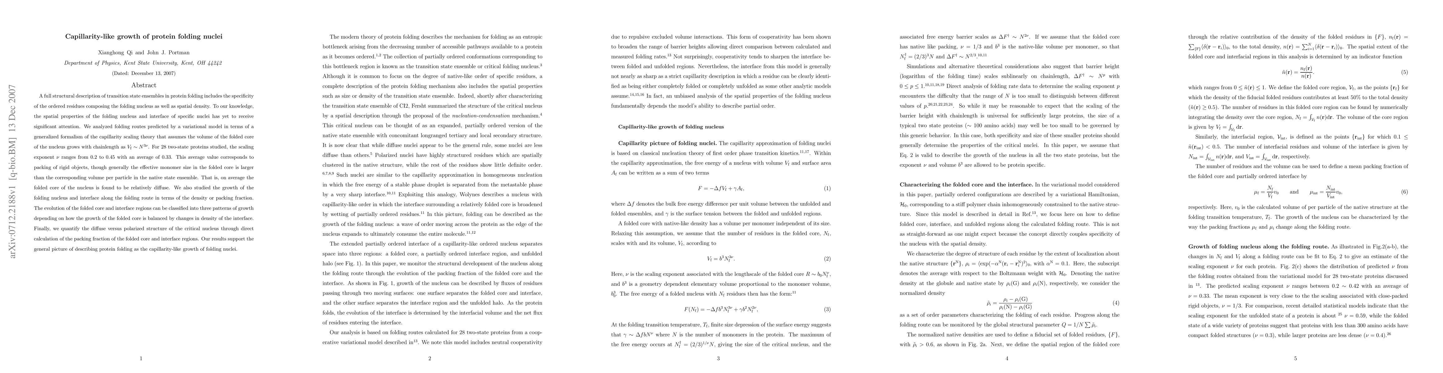 This study applies capillarity scaling theory to analyze the folding routes of 28 two-state proteins, finding an average scaling exponent of 0.33 indicative of diffuse packing. The research identifies three growth patterns for the folding nucleus and interface, supporting a capillarity-like model of protein folding.