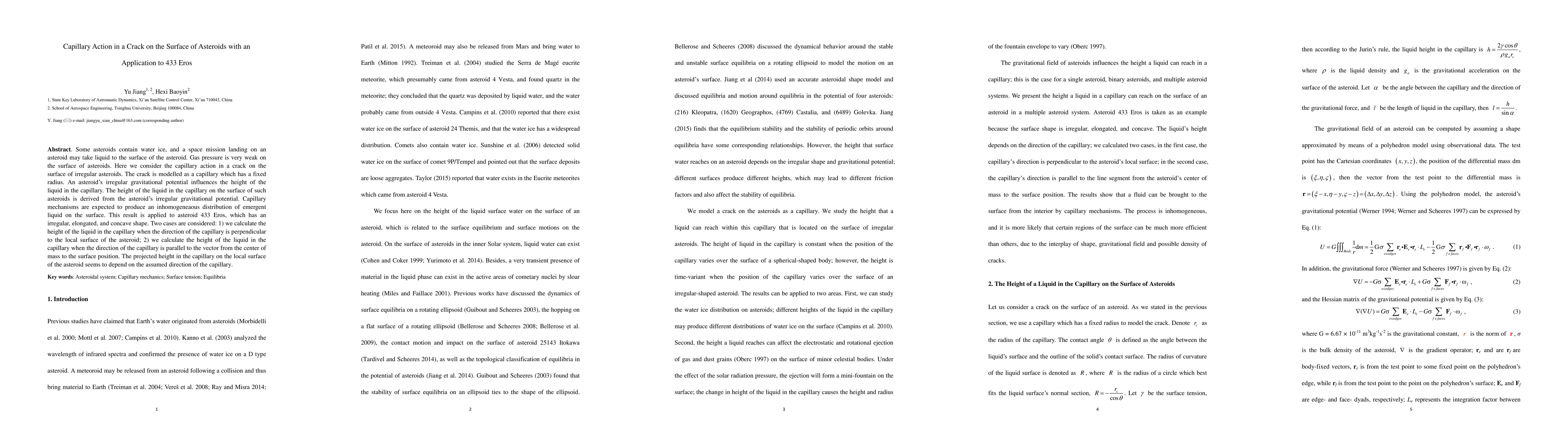 This paper explores capillary action in cracks on asteroid surfaces, particularly on 433 Eros, where weak gas pressure and irregular gravitational potential influence liquid height. The study derives liquid height in capillaries based on the asteroid's gravitational irregularities and finds that the liquid distribution depends on the capillary's orientation relative to the asteroid's surface.
