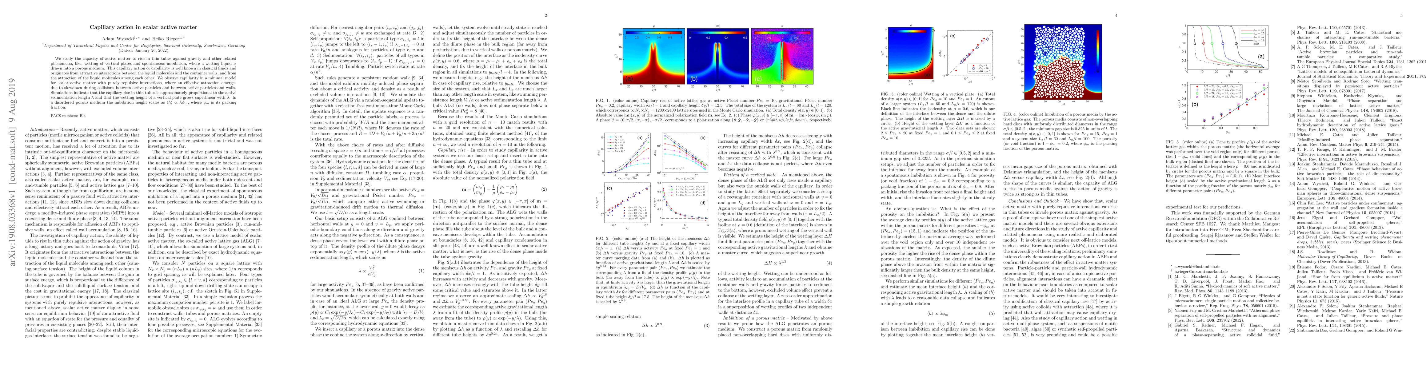 We study the capacity of active matter to rise in thin tubes against gravity and other related phenomena, like, wetting of vertical plates and spontaneous imbibition, where a wetting liquid is drawn into a porous medium. This capillary action or capillarity is well known in classical fluids and originates from attractive interactions between the liquid molecules and the container walls, and from the attraction of the liquid molecules among each other. We observe capillarity in a minimal model for scalar active matter with purely repulsive interactions, where an effective attraction emerges due to slowdown during collisions between active particles and between active particles and walls. Simulations indicate that the capillary rise in thin tubes is approximately proportional to the active sedimentation length $\lambda$ and that the wetting height of a vertical plate grows superlinear with $\lambda$. In a disordered porous medium the imbibition height scales as $\langle h\rangle\propto\lambda\phi_m$, where $\phi_m$ is its packing fraction.