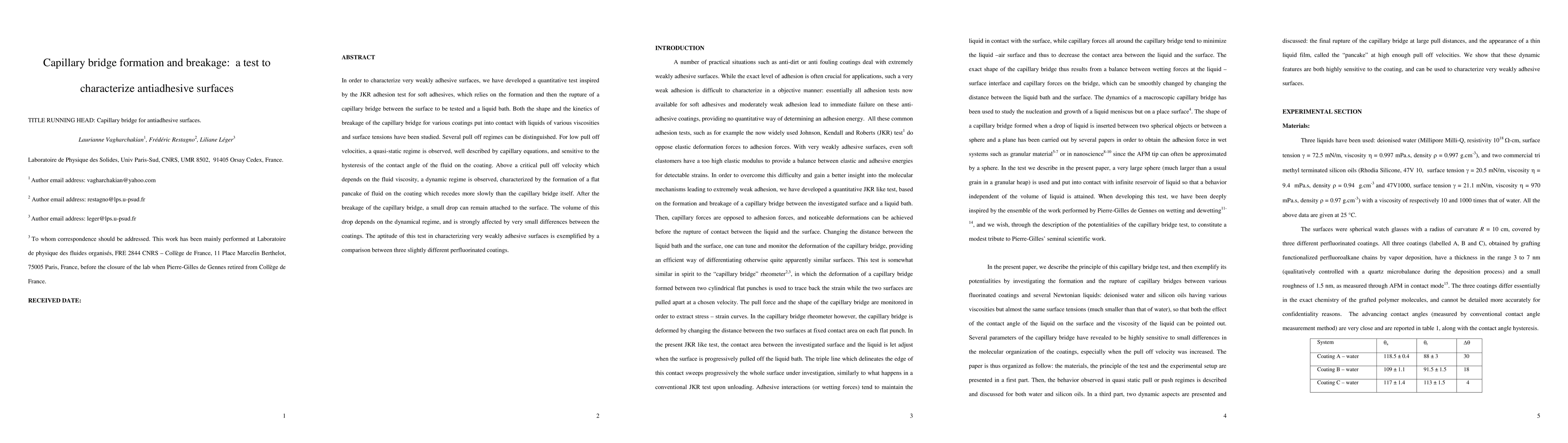 In order to characterize very weak adhesive surfaces, we have developed a quantitative test inspired by the Johnson, Kendall, and Roberts adhesion test for soft adhesives, which relies on the formation and then the rupture of a capillary bridge between the surface to be tested and a liquid bath. Both the shape and the kinetics of breakage of the capillary bridge for various coatings put into contact with liquids of various viscosities and surface tensions have been studied. Several pull off regimes can be distinguished. For low pull off velocities, a quasi-static regime is observed, well described by capillary equations and sensitive to the hysteresis of the contact angle of the fluid on the coating. Above a critical pull off velocity that depends on the fluid viscosity, a dynamic regime is observed, characterized by the formation of a flat pancake of fluid on the coating that recedes more slowly than the capillary bridge itself. After the breakage of the capillary bridge, a small drop can remain attached to the surface. The volume of this drop depends on the dynamical regime and is strongly affected by very small differences between the coatings. The aptitude of this test in characterizing very weakly adhesive surfaces is exemplified by a comparison between three different perfluorinated coatings.