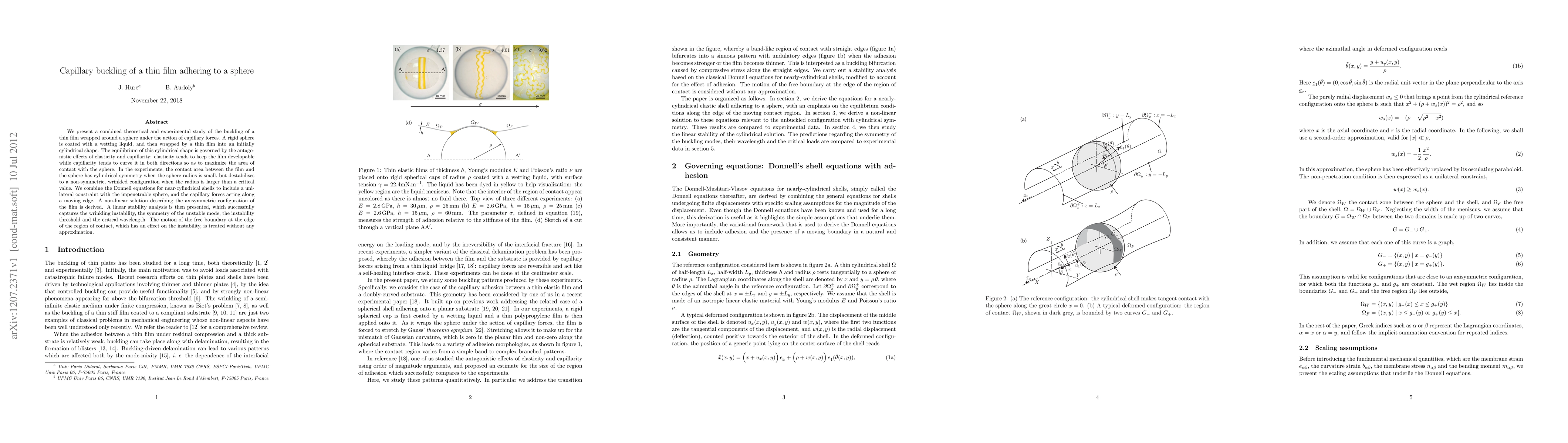 We present a combined theoretical and experimental study of the buckling of a thin film wrapped around a sphere under the action of capillary forces. A rigid sphere is coated with a wetting liquid, and then wrapped by a thin film into an initially cylindrical shape. The equilibrium of this cylindrical shape is governed by the antagonistic effects of elasticity and capillarity: elasticity tends to keep the film developable while capillarity tends to curve it in both directions so as to maximize the area of contact with the sphere. In the experiments, the contact area between the film and the sphere has cylindrical symmetry when the sphere radius is small, but destabilises to a non-symmetric, wrinkled configuration when the radius is larger than a critical value. We combine the Donnell equations for near-cylindrical shells to include a unilateral constraint with the impenetrable sphere, and the capillary forces acting along a moving edge. A non-linear solution describing the axisymmetric configuration of the film is derived. A linear stability analysis is then presented, which successfully captures the wrinkling instability, the symmetry of the unstable mode, the instability threshold and the critical wavelength. The motion of the free boundary at the edge of the region of contact, which has an effect on the instability, is treated without any approximation.