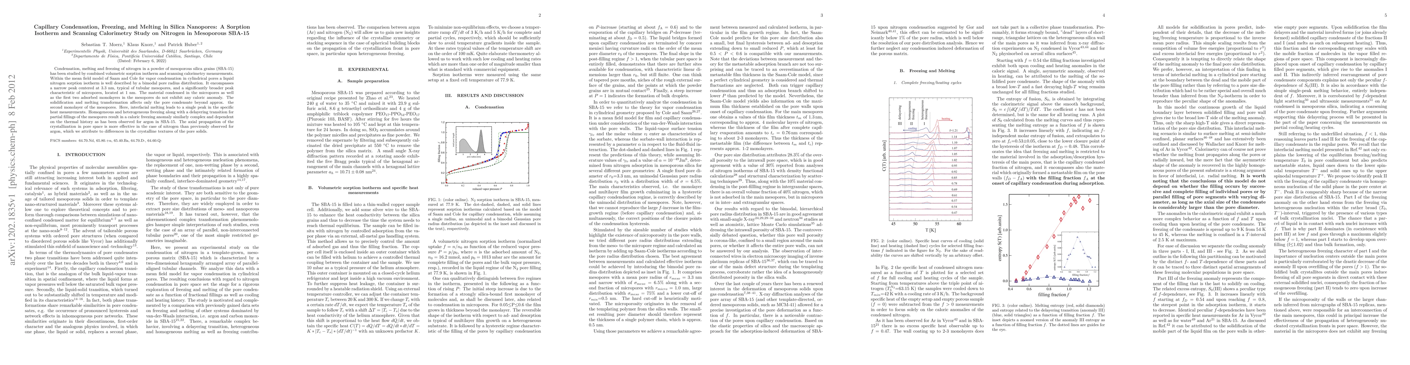 This study explores nitrogen condensation, freezing, and melting in mesoporous SBA-15 silica using sorption isotherms and scanning calorimetry. The bimodal pore radius distribution reveals distinct behaviors in micropores and mesopores, with significant caloric anomalies observed only beyond the second monolayer in mesopores.