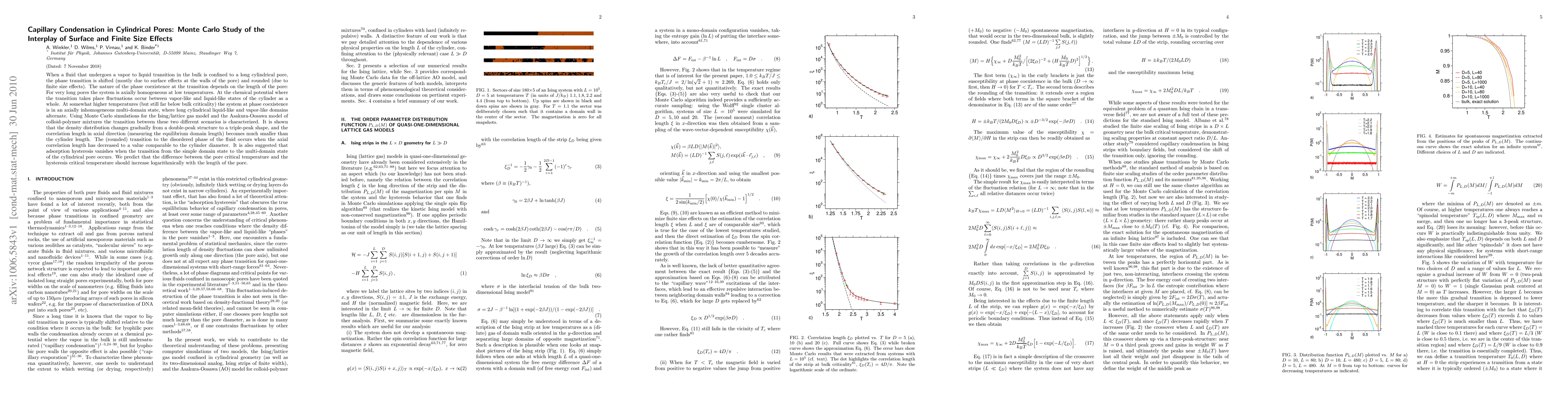 This paper investigates capillary condensation in cylindrical pores using Monte Carlo simulations, focusing on the interplay between surface and finite size effects. It finds that phase transitions shift and round due to these effects, with the system transitioning from axially homogeneous to axially inhomogeneous multi-domain states as pore length increases, and predicts a logarithmic increase in the difference between pore critical and hysteresis critical temperatures with pore length.