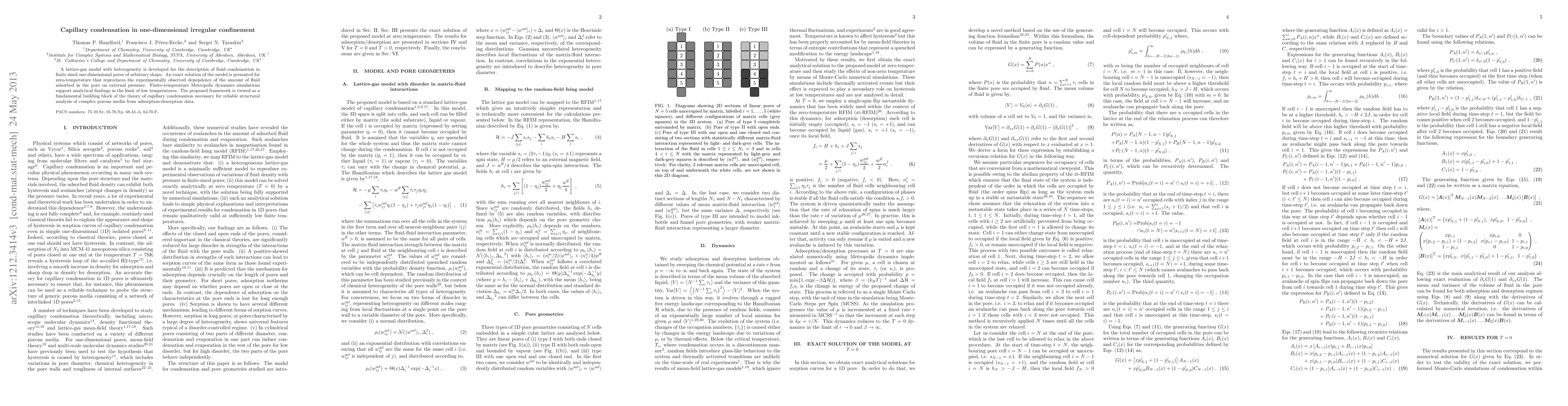 A lattice-gas model with heterogeneity is developed for the description of fluid condensation in finite sized one-dimensional pores of arbitrary shape. An exact solution of the model is presented for zero-temperature that reproduces the experimentally observed dependence of the amount of fluid adsorbed in the pore on external pressure. Finite-temperature Metropolis dynamics simulations support analytical findings in the limit of low temperatures. The proposed framework is viewed as a fundamental building block of the theory of capillary condensation necessary for reliable structural analysis of complex porous media from adsorption-desorption data.