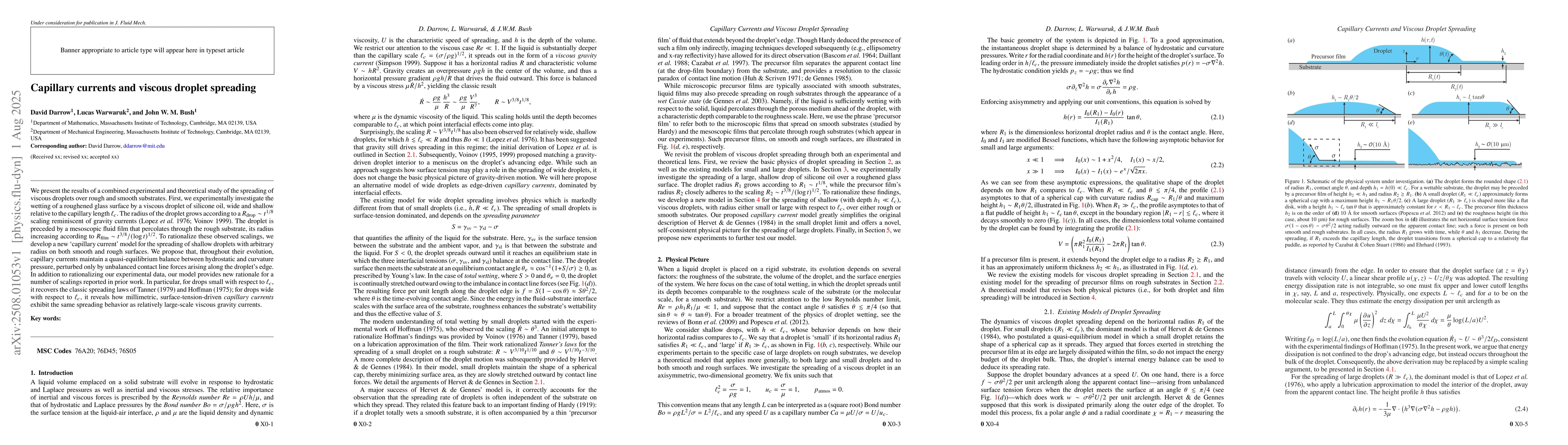 We present the results of a combined experimental and theoretical study of the spreading of viscous droplets over rough and smooth substrates. First, we experimentally investigate the wetting of a roughened glass surface by a viscous droplet of silicone oil, wide and shallow relative to the capillary length $\ell_c$. The radius of the droplet grows according to a $R_\mathrm{drop}\sim t^{1/8}$ scaling reminiscent of gravity currents (Lopez, 1976; Voinov, 1999). The droplet is preceded by a mesoscopic fluid film that percolates through the rough substrate, its radius increasing according to $R_\mathrm{film}\sim t^{3/8}/(\log t)^{1/2}$. To rationalize these observed scalings, we develop a new 'capillary current' model for the spreading of shallow droplets with arbitrary radius on both smooth and rough surfaces. We propose that, throughout their evolution, capillary currents maintain a quasi-equilibrium balance between hydrostatic and curvature pressure, perturbed only by unbalanced contact line forces arising along the droplet's edge. In addition to rationalizing our experimental data, our model provides new rationale for a number of scalings reported in prior work. In particular, for drops small with respect to $\ell_c$, it recovers the classic spreading laws of Tanner (1979) and Hoffman (1975); for drops wide with respect to $\ell_c$, it reveals how millimetric, surface-tension-driven capillary currents exhibit the same spreading behavior as relatively large-scale viscous gravity currents.