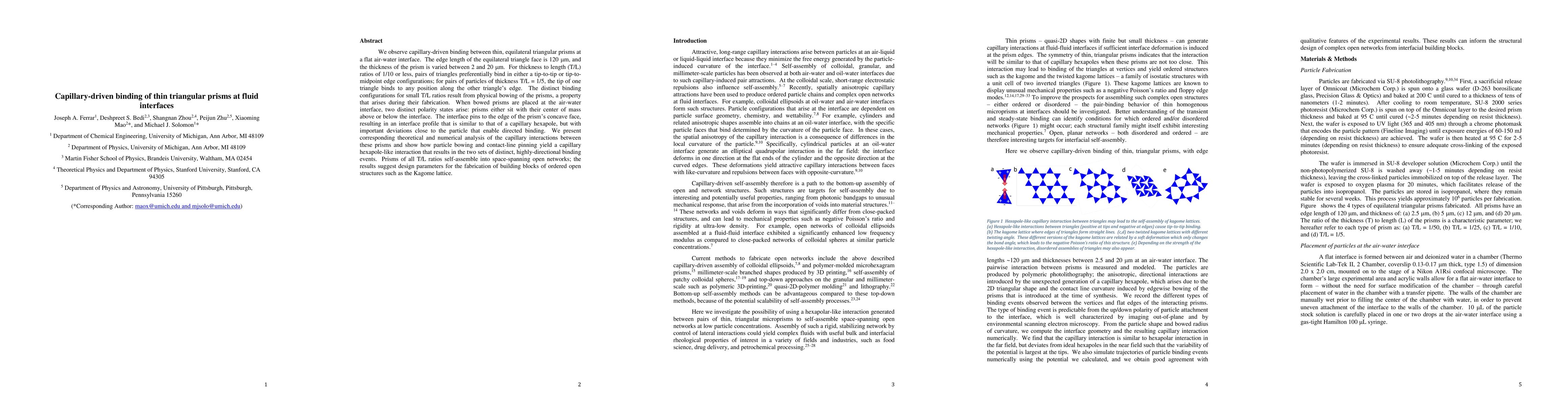 We observe capillary-driven binding between thin, equilateral triangular prisms at a flat air-water interface. The edge length of the equilateral triangle face is 120 $\mu m$, and the thickness of the prism is varied between 2 and 20 $\mu m$. For thickness to length (T/L) ratios of 1/10 or less, pairs of triangles preferentially bind in either a tip-to-tip or tip-to-midpoint edge configurations; for pairs of particles of thickness T/L = 1/5, the tip of one triangle binds to any position along the other triangle's edge. The distinct binding configurations for small T/L ratios result from physical bowing of the prisms, a property that arises during their fabrication. When bowed prisms are placed at the air-water interface, two distinct polarity states arise: prisms either sit with their center of mass above or below the interface. The interface pins to the edge of the prism's concave face, resulting in an interface profile that is similar to that of a capillary hexapole, but with important deviations close to the particle that enable directed binding. We present corresponding theoretical and numerical analysis of the capillary interactions between these prisms and show how particle bowing and contact-line pinning yield a capillary hexapole-like interaction that results in the two sets of distinct, highly-directional binding events. Prisms of all T/L ratios self-assemble into space-spanning open networks; the results suggest design parameters for the fabrication of building blocks of ordered open structures such as the Kagome lattice.