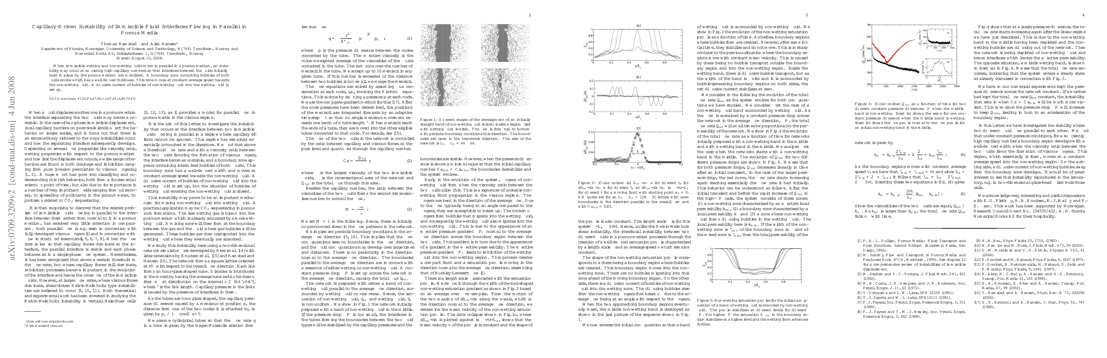 When immiscible wetting and non-wetting fluids move in parallel in a porous medium, an instability may occur at sufficiently high capillary numbers so that interfaces between the fluids initially held in place by the porous medium are mobilized. A boundary zone containing bubbles of both fluids evolve which has a well defined thickness. This zone moves at constant average speed towards the non-wetting fluid. A diffusive current of bubbles of non-wetting fluid into the wetting fluid is set up.