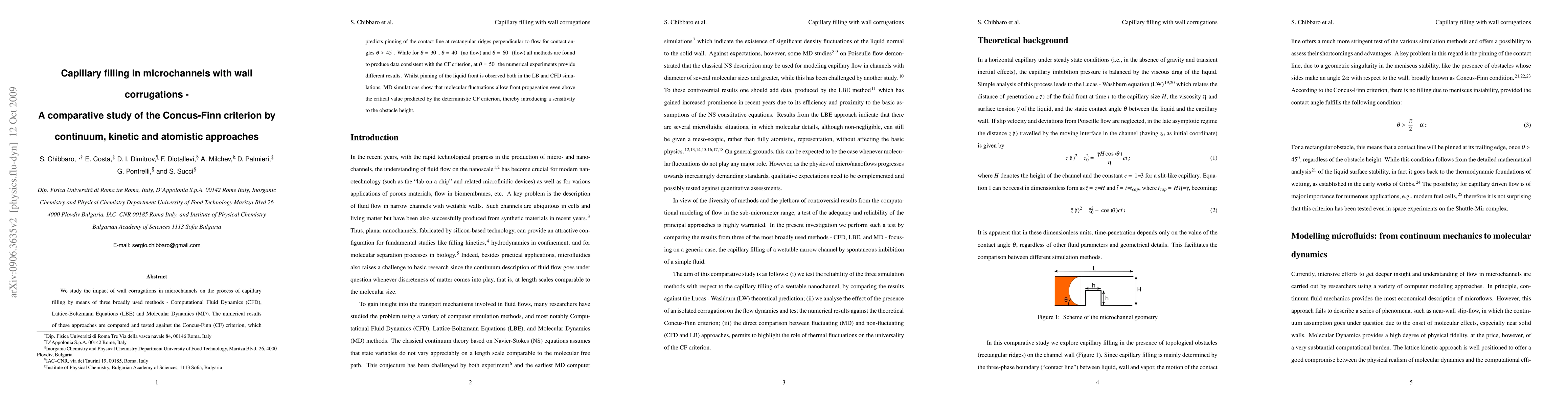 This study examines capillary filling in microchannels with wall corrugations using CFD, LBE, and MD methods, comparing results against the Concus-Finn criterion. At specific contact angles, all methods align with the criterion, but at θ = 50°, MD simulations reveal that molecular fluctuations allow liquid front propagation beyond the criterion's prediction, indicating a dependency on obstacle height.