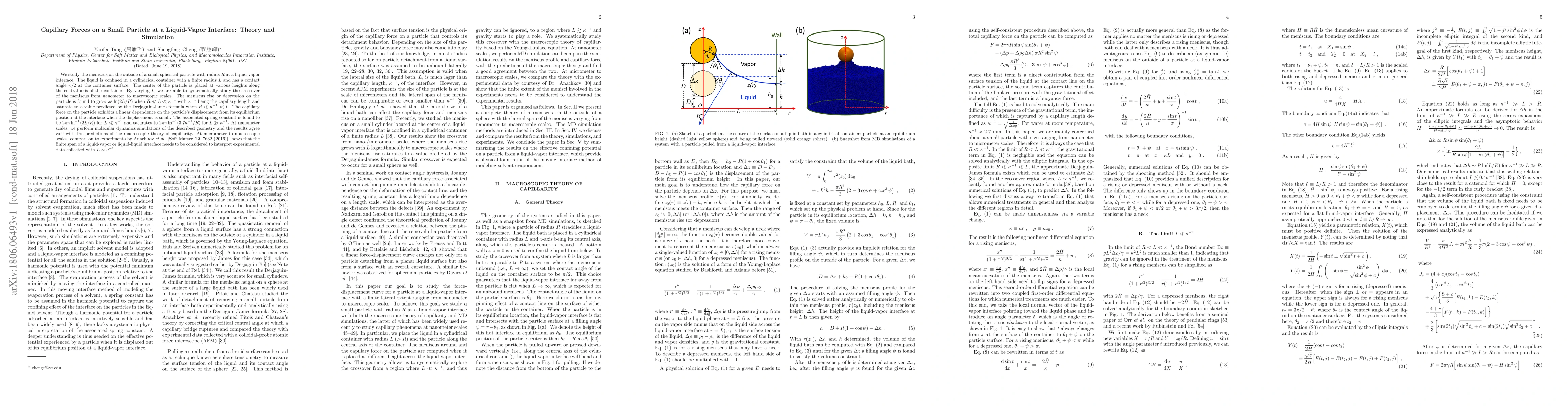This paper investigates the capillary forces acting on a small spherical particle at a liquid-vapor interface, finding that meniscus rise grows logarithmically with container radius and saturates according to the Derjaguin-James formula. Molecular dynamics simulations corroborate macroscopic theory predictions at nanometer scales.