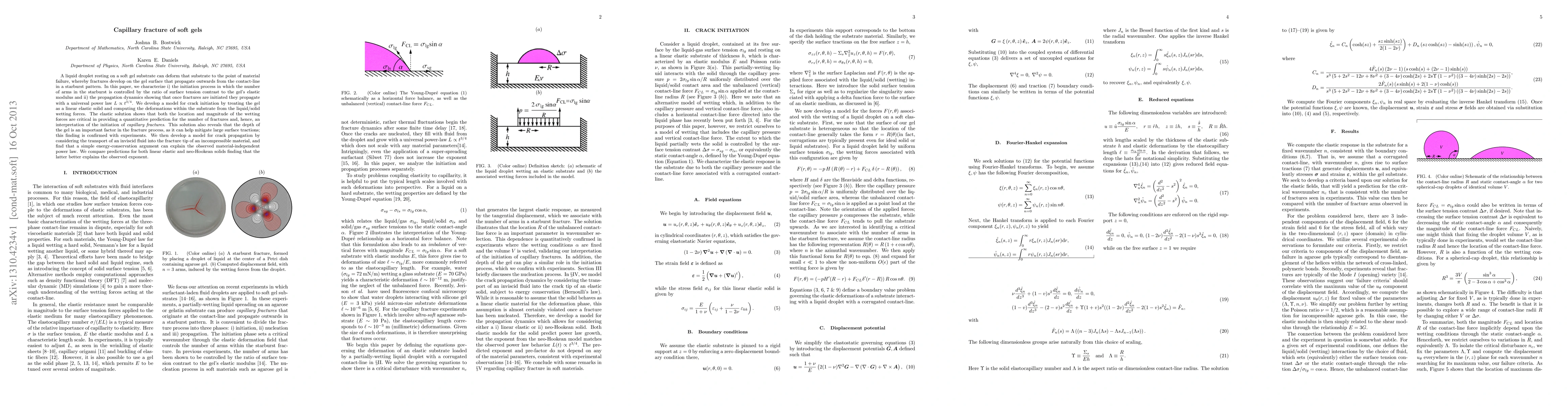A liquid droplet resting on a soft gel substrate can deform that substrate to the point of material failure, whereby fractures develop on the gel surface that propagate outwards from the contact-line in a starburst pattern. In this paper, we characterize i) the initiation process in which the number of arms in the starburst is controlled by the ratio of surface tension contrast to the gel's elastic modulus and ii) the propagation dynamics showing that once fractures are initiated they propagate with a universal power law $L\propto t^{3/4}$. We develop a model for crack initiation by treating the gel as a linear elastic solid and computing the deformations within the substrate from the liquid/solid wetting forces. The elastic solution shows that both the location and magnitude of the wetting forces are critical in providing a quantitative prediction for the number of fractures and, hence, an interpretation of the initiation of capillary fractures. This solution also reveals that the depth of the gel is an important factor in the fracture process, as it can help mitigate large surface tractions; this finding is confirmed with experiments. We then develop a model for crack propagation by considering the transport of an inviscid fluid into the fracture tip of an incompressible material, and find that a simple energy-conservation argument can explain the observed material-independent power law. We compare predictions for both linear elastic and neo-Hookean solids finding that the latter better explains the observed exponent.