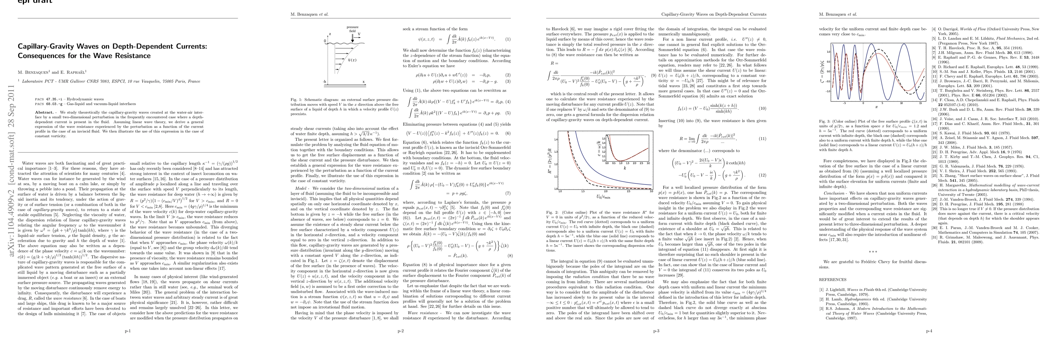 This paper theoretically investigates capillary-gravity waves generated by small perturbations in a fluid with an initial depth-dependent current, deriving a general expression for wave resistance in an inviscid fluid. It particularly examines the wave resistance behavior under a linear current profile, relevant for some wind-generated currents.