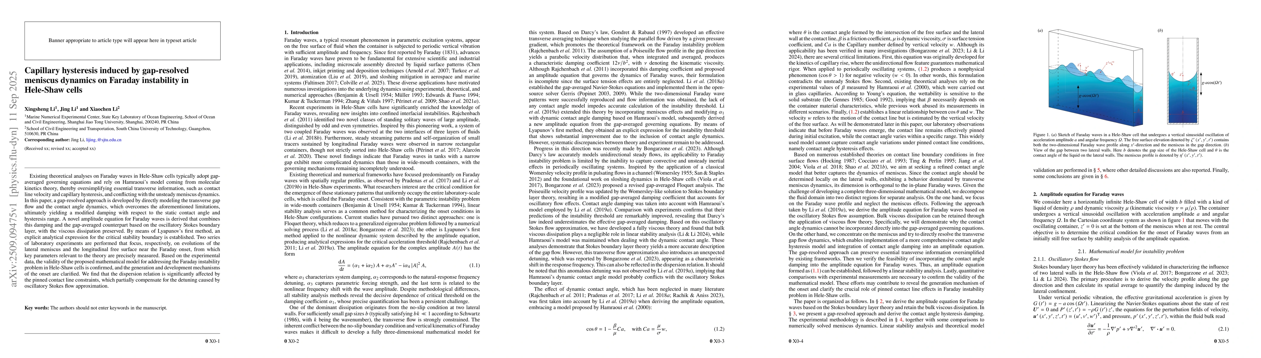 Existing theoretical analyses on Faraday waves in Hele-Shaw cells typically adopt gap-averaged governing equations and rely on Hamraoui's model coming from molecular kinetics theory, thereby oversimplifying essential transverse information, such as contact line velocity and capillary hysteresis, and conflicting with the unsteady meniscus dynamics. In this paper, a gap-resolved approach is developed by directly modeling the transverse gap flow and the contact angle dynamics, which overcomes the aforementioned limitations, ultimately yielding a modified damping with respect to the static contact angle and hysteresis range. A novel amplitude equation for Faraday waves is derived that combines this damping and the gap-averaged counterpart based on the oscillatory Stokes boundary layer, with the viscous dissipation preserved. By means of Lyapunov's first method, an explicit analytical expression for the critical stability boundary is established. Two series of laboratory experiments are performed that focus, respectively, on evolutions of the lateral meniscus and the longitudinal free surface near the Faraday onset, from which key parameters relevant to the theory are precisely measured. Based on the experimental data, the validity of the proposed mathematical model for addressing the Faraday instability problem in Hele-Shaw cells is confirmed, and the generation and development mechanisms of the onset are clarified. We find that the dispersion relation is significantly affected by the pinned contact line constraints, which partially compensate for the detuning caused by oscillatory Stokes flow approximation.