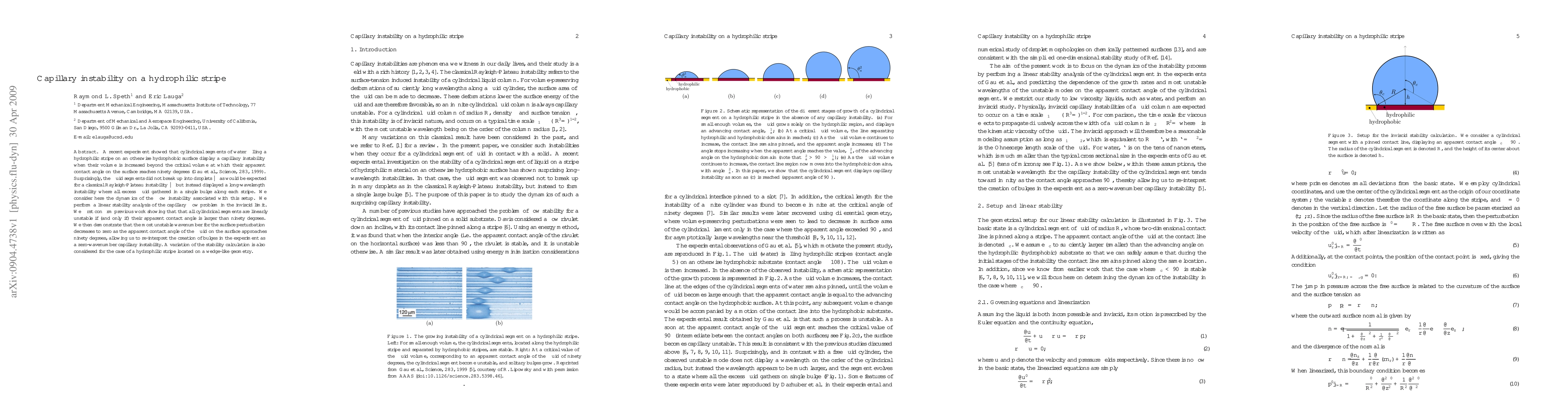 This paper investigates the capillary instability of cylindrical water segments on a hydrophilic stripe, finding that beyond a critical volume, the segments develop a long-wavelength instability forming a single bulge instead of breaking into droplets. The study confirms linear instability when the apparent contact angle exceeds ninety degrees and reinterprets the observed bulges as a zero-wavenumber capillary instability.
