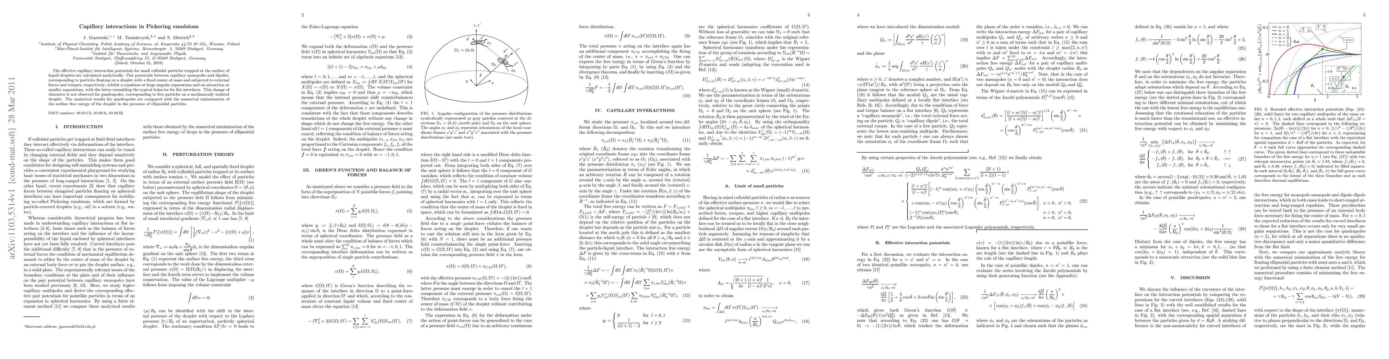 The effective capillary interaction potentials for small colloidal particles trapped at the surface of liquid droplets are calculated analytically. Pair potentials between capillary monopoles and dipoles, corresponding to particles floating on a droplet with a fixed center of mass and subjected to external forces and torques, respectively, exhibit a repulsion at large angular separations and an attraction at smaller separations, with the latter resembling the typical behavior for flat interfaces. This change of character is not observed for quadrupoles, corresponding to free particles on a mechanically isolated droplet. The analytical results for quadrupoles are compared with the numerical minimization of the surface free energy of the droplet in the presence of ellipsoidal particles.