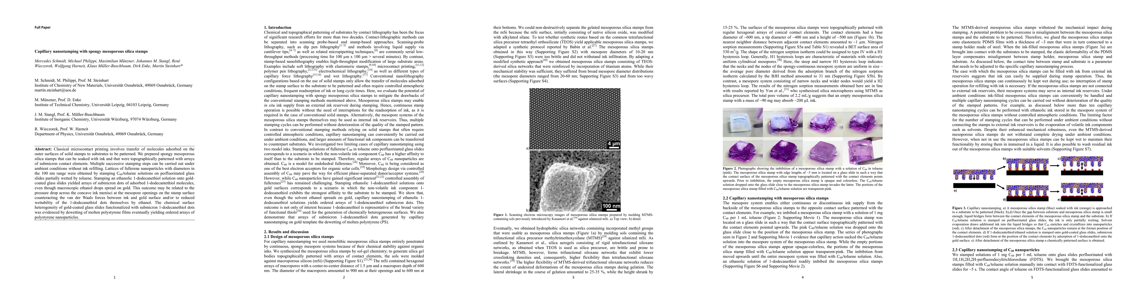 This paper explores the use of spongy mesoporous silica stamps for capillary nanostamping, achieving precise transfer of fullerene nanoparticles and 1-dodecanethiol molecules onto various substrates. The method allows for multiple stamping steps without ink refilling, demonstrating effective patterning even against spreading ethanol.