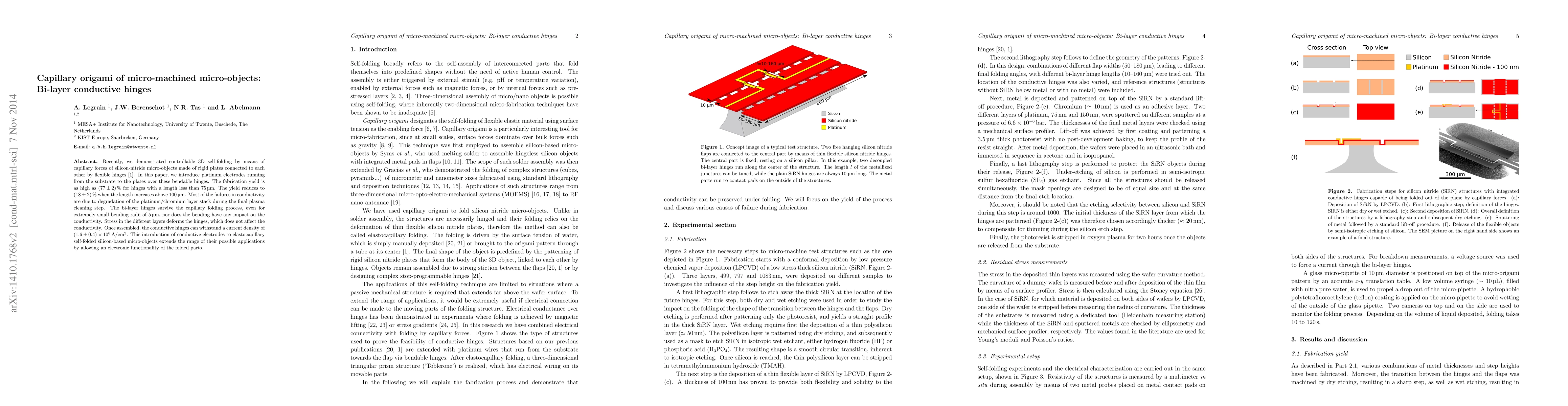 Recently, we demonstrated controllable 3D self-folding by means of capillary forces of silicon-nitride micro-objects made of rigid plates connected to each other by flexible hinges [1]. In this paper, we introduce platinum electrodes running from the substrate to the plates over these bendable hinges. The fabrication yield is as high as (77 +/- 2) % for hinges with a length less than 75 {\mu}m. The yield reduces to (18 +/- 2) % when the length increases above 100 {\mu}m. Most of the failures in conductivity are due to degradation of the platinum/chromium layer stack during the final plasma cleaning step. The bi-layer hinges survive the capillary folding process, even for extremely small bending radii of 5 {\mu}m, nor does the bending have any impact on the conductivity. Stress in the different layers deforms the hinges, which does not affect the conductivity. Once assembled, the conductive hinges can withstand a current density of (1.6 +/- 0.4) $10^6$ A/cm$^2$ . This introduction of conductive electrodes to elastocapillary self-folded silicon-based micro-objects extends the range of their possible applications by allowing an electronic functionality of the folded parts.
