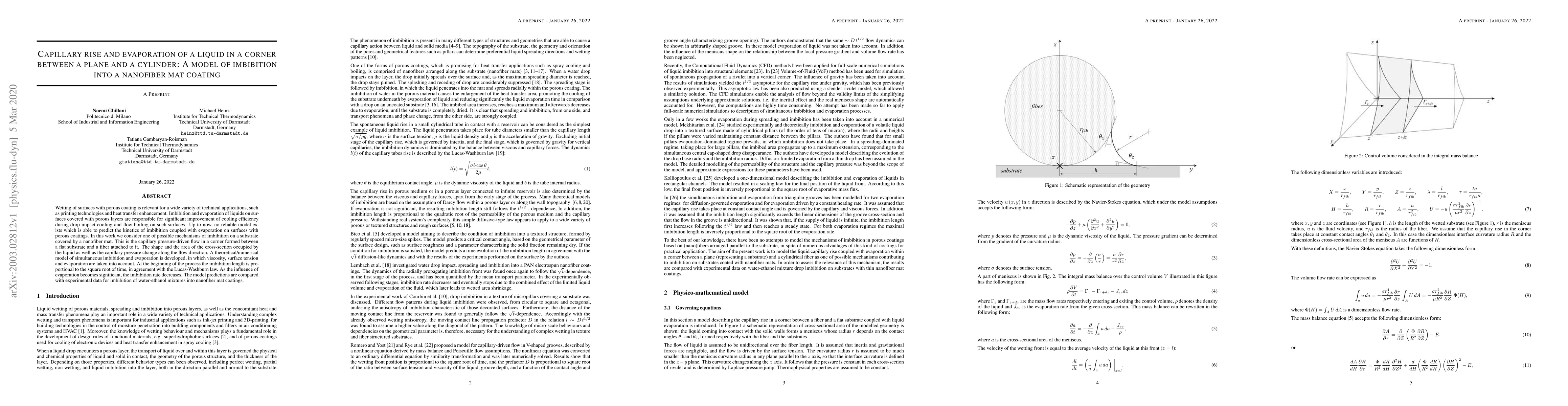 This paper develops a theoretical/numerical model to predict the kinetics of imbibition coupled with evaporation in a nanofiber mat coating, focusing on capillary pressure-driven flow in a corner between a plane and a cylinder. The model accounts for viscosity, surface tension, and evaporation effects, showing that imbibition initially follows the Lucas-Washburn law but slows as evaporation influences become more significant.