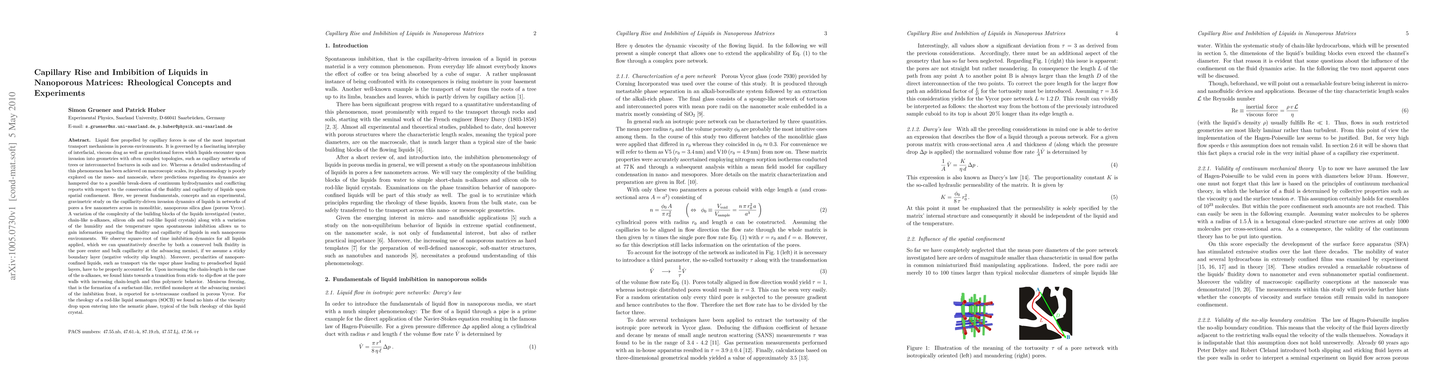 Liquid flow propelled by capillary forces is one of the most important transport mechanisms in porous environments. It is governed by a fascinating interplay of interfacial, viscous drag as well as gravitational forces which liquids encounter upon invasion into geometries with often complex topologies, such as capillary networks of trees or interconnected fractures in soils and ice. Here, we present fundamentals, concepts and an experimental, gravimetric study on the capillarity-driven invasion dynamics of liquids in networks of pores a few nanometers across in monolithic, nanoporous silica glass (porous Vycor). A variation of the complexity of the building blocks of the liquids investigated along with a variation of the humidity and the temperature upon spontaneous imbibition allows us to gain information regarding the fluidity and capillarity of liquids in such nanoporous environments. We observe square-root of time imbibition dynamics for all liquids applied, which we can quantitatively describe by both a conserved bulk fluidity in the pore center and bulk capillarity at the advancing menisci, if we assume a sticky boundary layer (negative velocity slip length). Moreover, pecularities of nanopore-confined liquids, such as transport via the vapor phase leading to preadsorbed liquid layers, have to be properly accounted for. Upon increasing the chain-length in the case of the n-alkanes, we found hints towards a transition from stick- to slip-flow at the pore walls with increasing chain-length and thus polymeric behavior. Meniscus freezing is reported for n-tetracosane confined in porous Vycor. For the rheology of a rod-like liquid nematogen (8OCB) we found no hints of the viscosity drop upon entering into the nematic phase, typical of the bulk rheology of this liquid crystal.