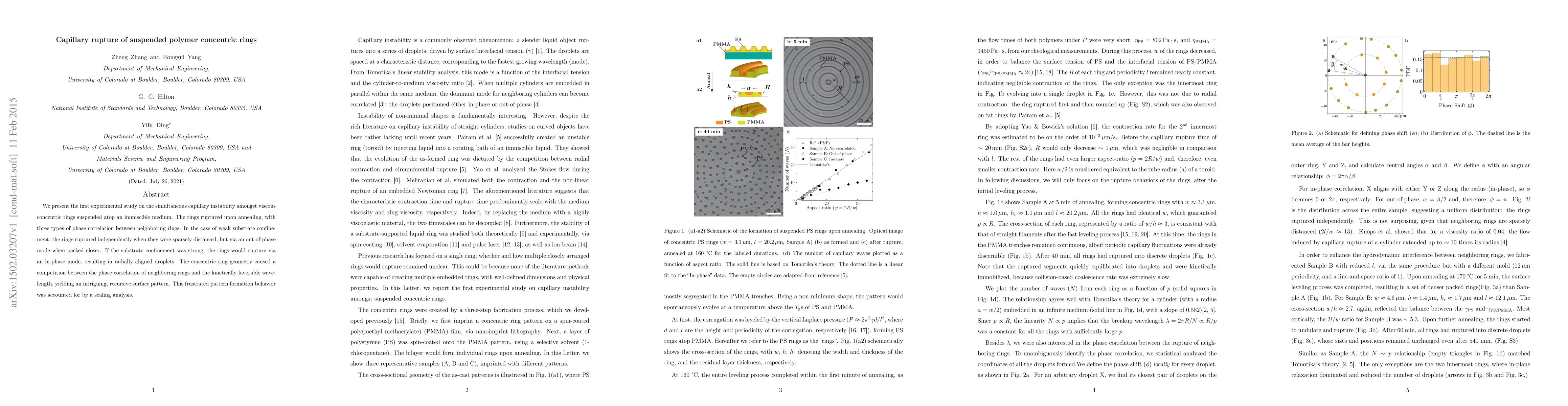 We present the first experimental study on the simultaneous capillary instability amongst viscous concentric rings suspended atop an immiscible medium. The rings ruptured upon annealing, with three types of phase correlation between neighboring rings. In the case of weak substrate confinement, the rings ruptured independently when they were sparsely distanced, but via an out-of-phase mode when packed closer. If the substrate confinement was strong, the rings would rupture via an in-phase mode, resulting in radially aligned droplets. The concentric ring geometry caused a competition between the phase correlation of neighboring rings and the kinetically favorable wavelength, yielding an intriguing, recursive surface pattern. This frustrated pattern formation behavior was accounted for by a scaling analysis.