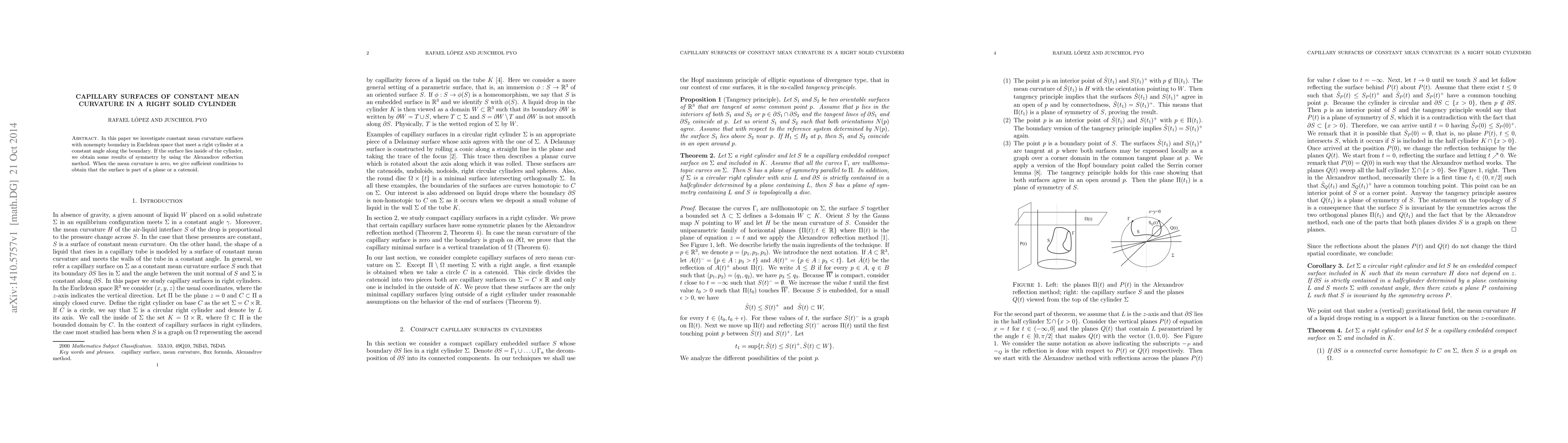 This paper explores constant mean curvature surfaces within a right cylinder that meet the boundary at a constant angle, deriving symmetry results via the Alexandrov reflection method. For zero mean curvature, it provides conditions for the surface to be a plane or a catenoid.