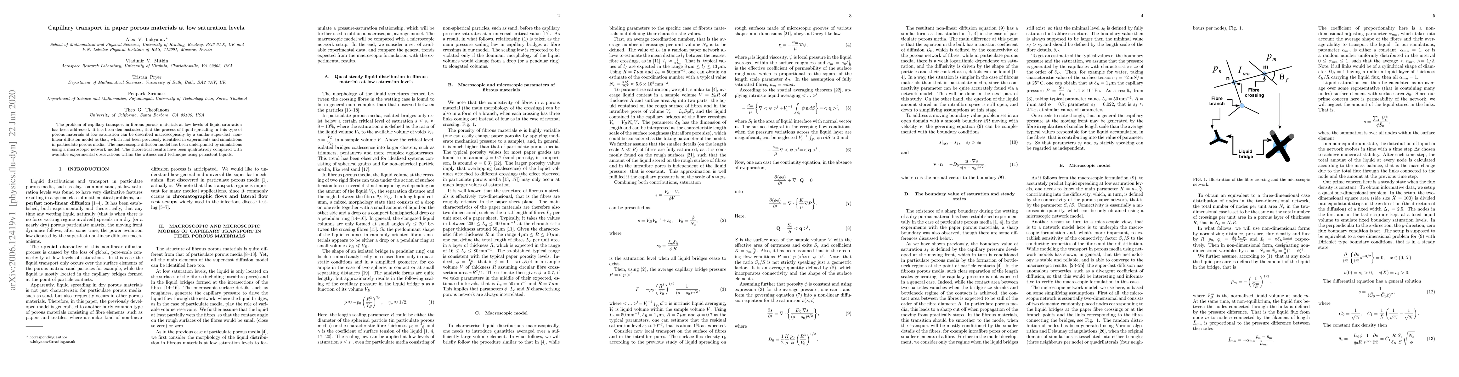 This paper investigates capillary transport in fibrous porous materials at low liquid saturation levels, demonstrating that a super-fast, non-linear diffusion model can describe liquid spreading. Simulations using a microscopic network model support the macroscopic diffusion model, which is qualitatively compared with experimental observations.