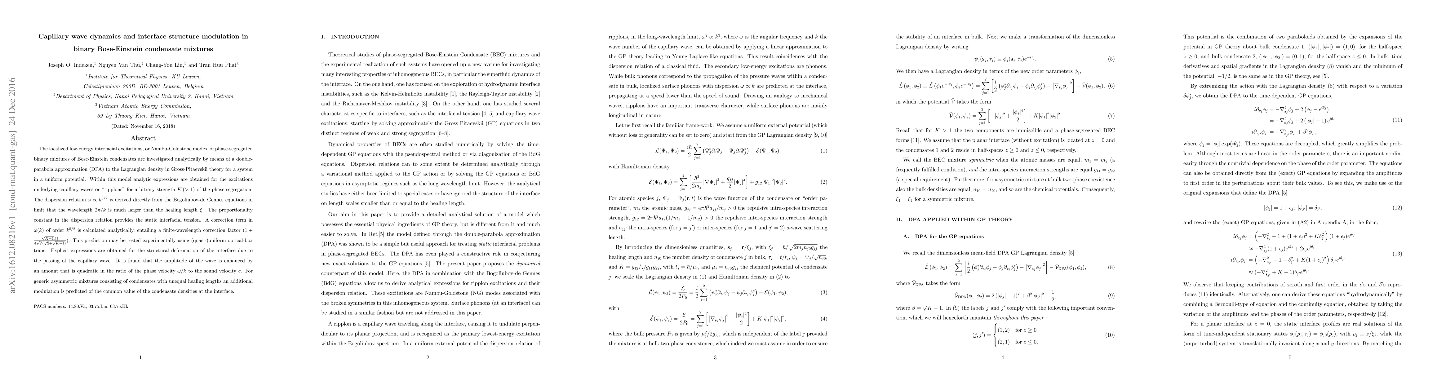 This paper investigates capillary wave dynamics and interface structure modulation in binary Bose-Einstein condensate mixtures using a double-parabola approximation. It derives a dispersion relation $\omega \propto k^{3/2}$ for "ripplons" and predicts a finite-wavelength correction factor, alongside structural deformations of the interface due to capillary wave passage.