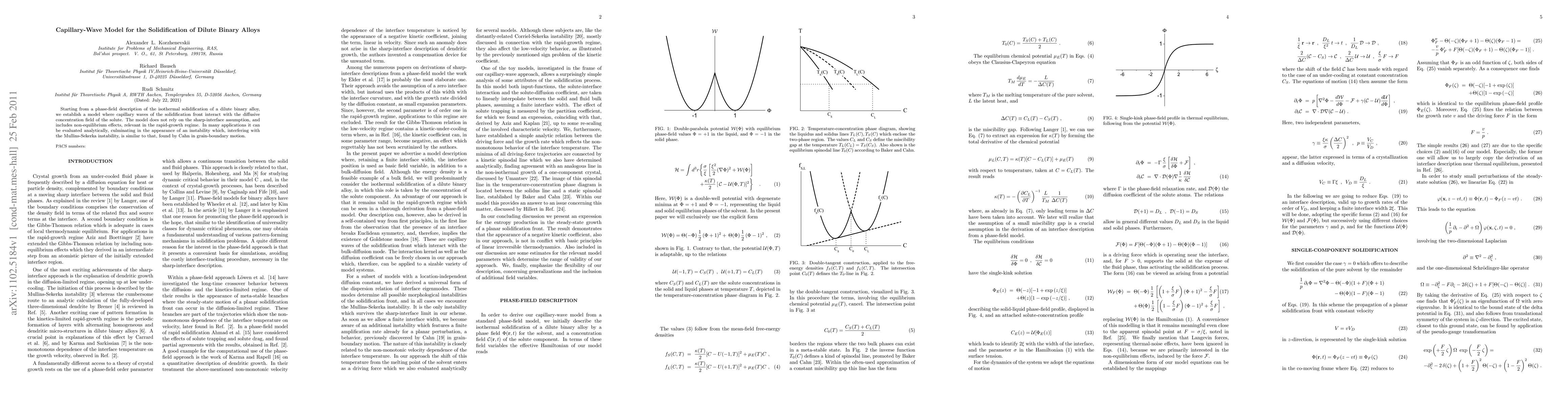 This paper develops a phase-field model for the isothermal solidification of dilute binary alloys, incorporating capillary waves at the solidification front and non-equilibrium effects. The model predicts an instability similar to the Mullins-Sekerka instability, which can be analytically evaluated in many applications.