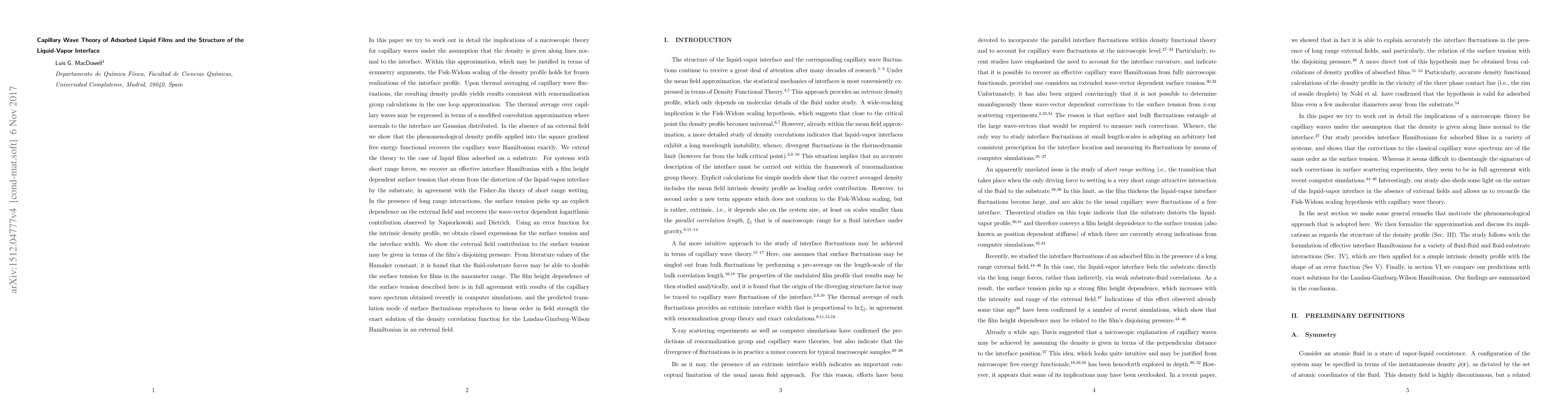 In this paper we try to work out in detail the implications of a microscopic theory for capillary waves under the assumption that the density is given along lines normal to the interface. Our study provides interface Hamiltonians for adsorbed films in a variety of systems, and shows that the corrections to the classical capillary wave spectrum are of the same order as the surface tension. This implies that it is possible, at least in principle, to measure them in x-ray surface scattering experiments. Interestingly, our study also sheds some light on the nature of the liquid-vapor interface in the absence of external fields and allows us to reconcile the Fisk-Widom scaling hypothesis with capillary wave theory.