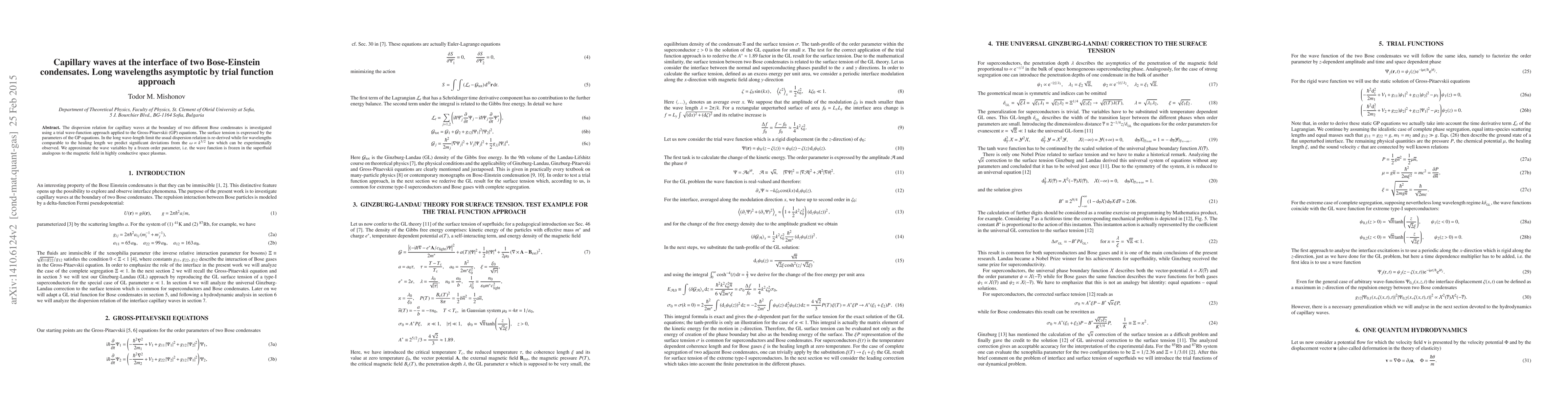 The dispersion relation for capillary waves at the boundary of two different Bose condensates is investigated using a trial wave-function approach applied to the Gross-Pitaevskii (GP) equations. The surface tension is expressed by the parameters of the GP equations. In the long wave-length limit the usual dispersion relation is re-derived while for wavelengths comparable to the healing length we predict significant deviations from the $\omega\propto k^{3/2}$ law which can be experimentally observed. We approximate the wave variables by a frozen order parameter, i.e. the wave function is frozen in the superfluid analogous to the magnetic field in highly conductive space plasmas.