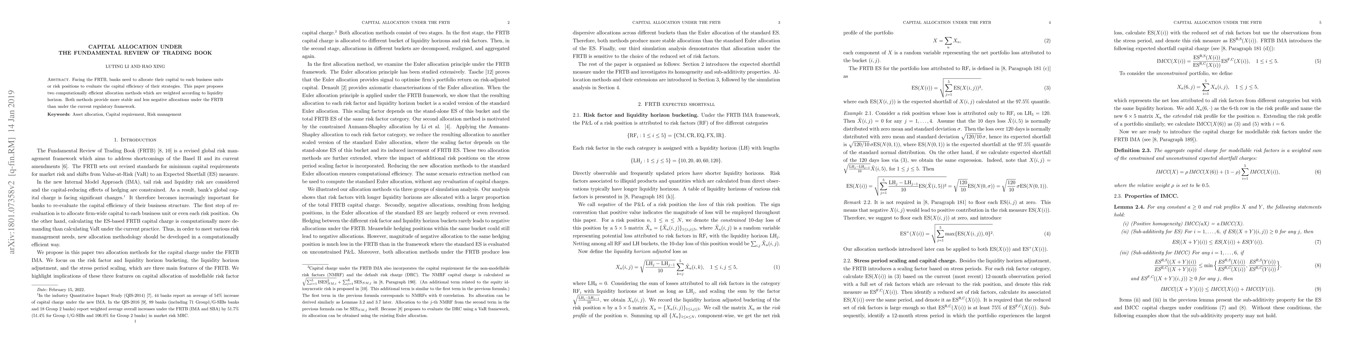 Facing the FRTB, banks need to allocate their capital to each business units or risk positions to evaluate the capital efficiency of their strategies. This paper proposes two computationally efficient allocation methods which are weighted according to liquidity horizon. Both methods provide more stable and less negative allocations under the FRTB than under the current regulatory framework.