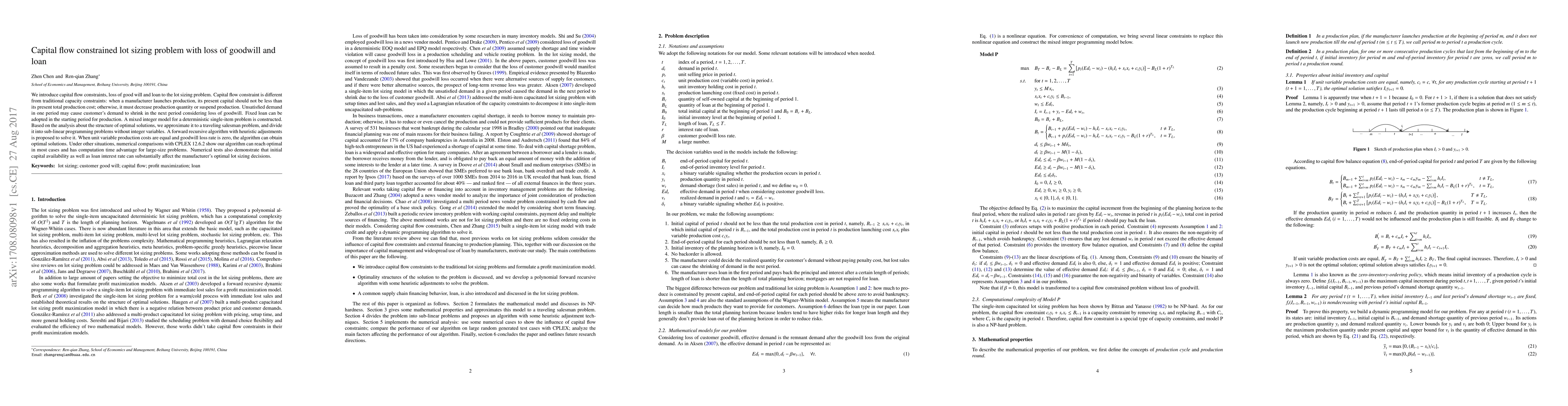 This paper addresses the lot sizing problem under capital flow constraints, loss of goodwill, and loan conditions. It proposes a mixed integer model and a forward recursive algorithm to solve it, demonstrating computational efficiency and sensitivity to initial capital and loan interest rates.