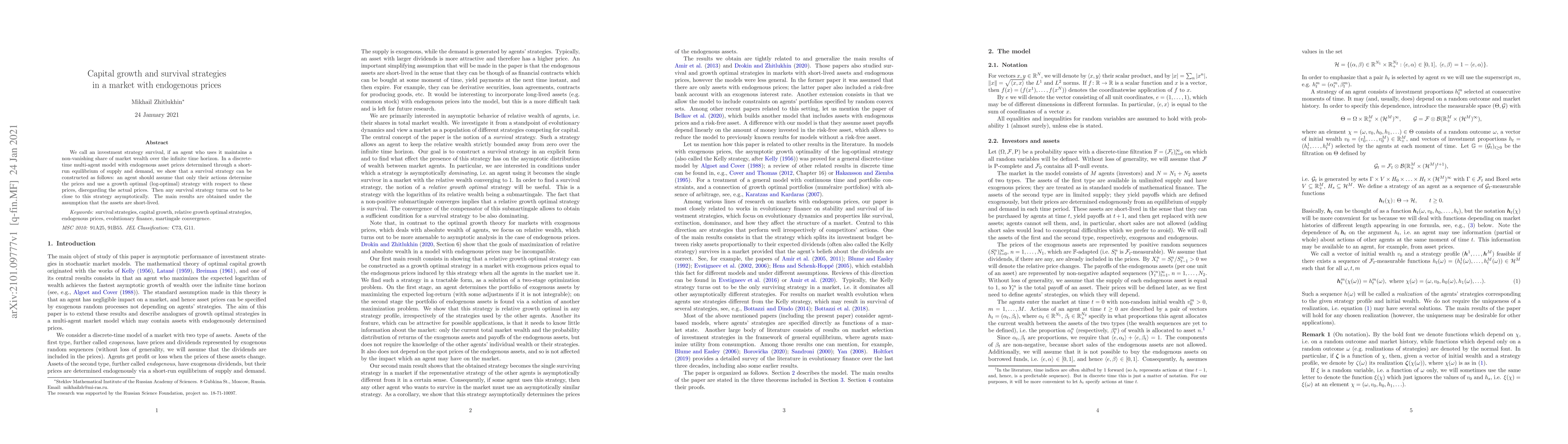 In a market with endogenous prices, agents can survive indefinitely by assuming their actions determine prices and using growth-optimal strategies, regardless of actual prices.