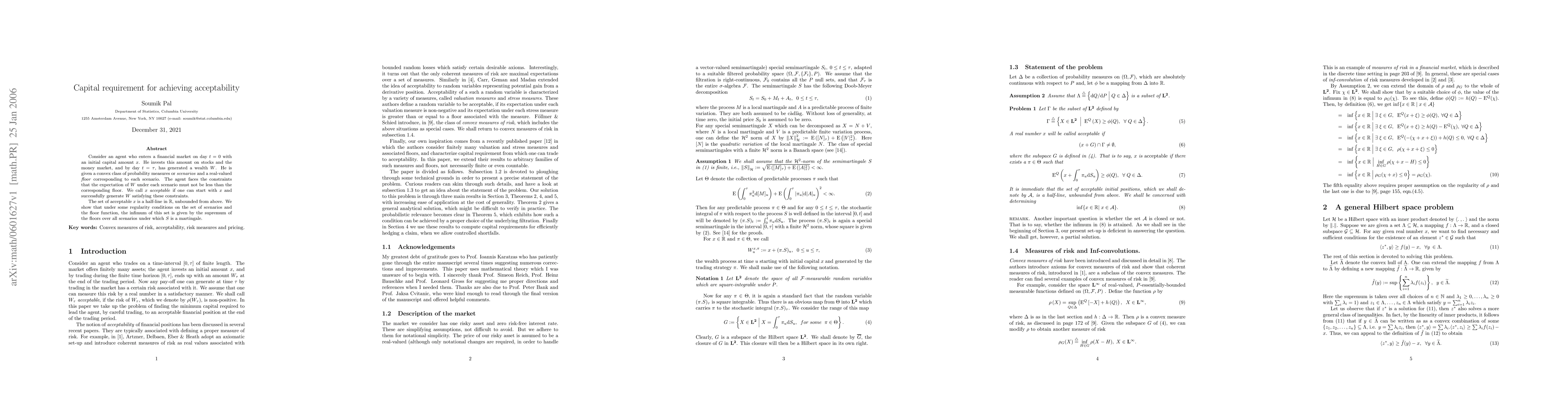Consider an agent who enters a financial market on day t = 0 with an initial capital amount x. He invests this amount on stocks and the money market, and by day t = T, has generated a wealth W . He is given a convex class of probability measures (called scenarios) and a real-valued function (or floors) corresponding to each scenario. The agent faces the constraints that the expectation of W under each scenario must not be less than the corresponding floor. We call x acceptable if one can start with x and successfully generate W satisfying these constraints. The set of acceptable x is a half-line in R, unbounded from above. We show that under some regularity conditions on the set of scenarios and the floor function, the infimum of this set is given by the supremum of the floors over all scenarios under which S is a martingale.
