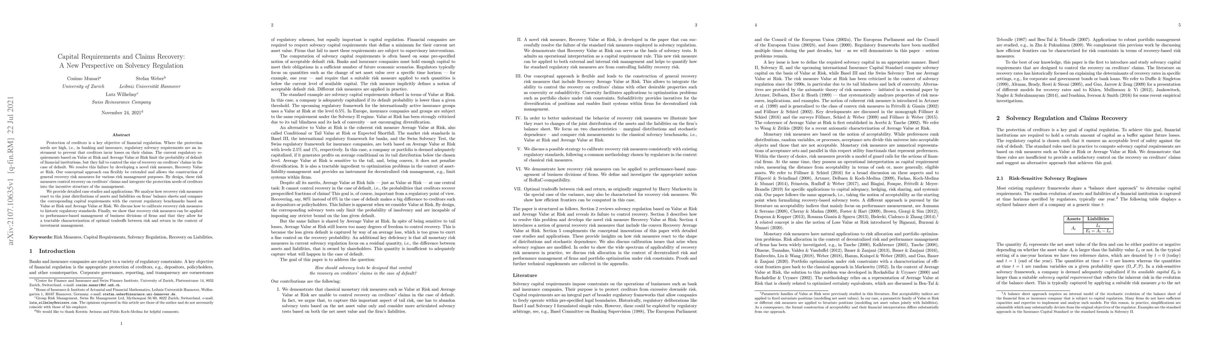 Protection of creditors is a key objective of financial regulation. Where the protection needs are high, i.e., in banking and insurance, regulatory solvency requirements are an instrument to prevent that creditors incur losses on their claims. The current regulatory requirements based on Value at Risk and Average Value at Risk limit the probability of default of financial institutions, but they fail to control the size of recovery on creditors' claims in the case of default. We resolve this failure by developing a novel risk measure, Recovery Value at Risk. Our conceptual approach can flexibly be extended and allows the construction of general recovery risk measures for various risk management purposes. By design, these risk measures control recovery on creditors' claims and integrate the protection needs of creditors into the incentive structure of the management. We provide detailed case studies and applications: We analyze how recovery risk measures react to the joint distributions of assets and liabilities on firms' balance sheets and compare the corresponding capital requirements with the current regulatory benchmarks based on Value at Risk and Average Value at Risk. We discuss how to calibrate recovery risk measures to historic regulatory standards. Finally, we show that recovery risk measures can be applied to performance-based management of business divisions of firms and that they allow for a tractable characterization of optimal tradeoffs between risk and return in the context of investment management.