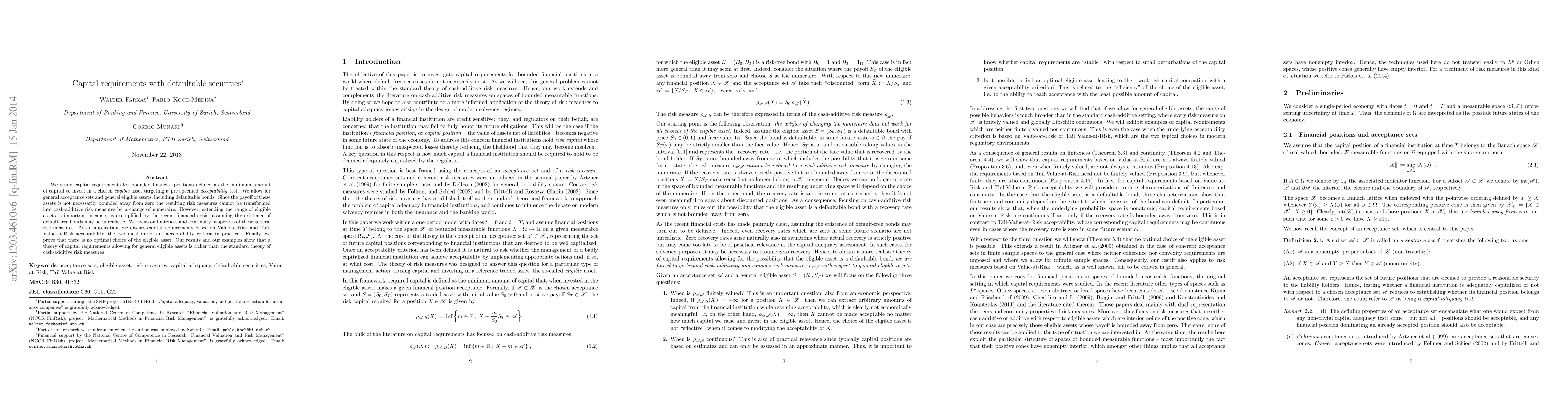 This paper explores capital requirements for financial positions involving defaultable securities, emphasizing the importance of including such assets due to the unrealistic assumption of default-free bonds. It investigates the finiteness and continuity properties of the resulting risk measures, applying them to Value-at-Risk and Tail-Value-at-Risk criteria, and concludes that there is no optimal choice of eligible asset.