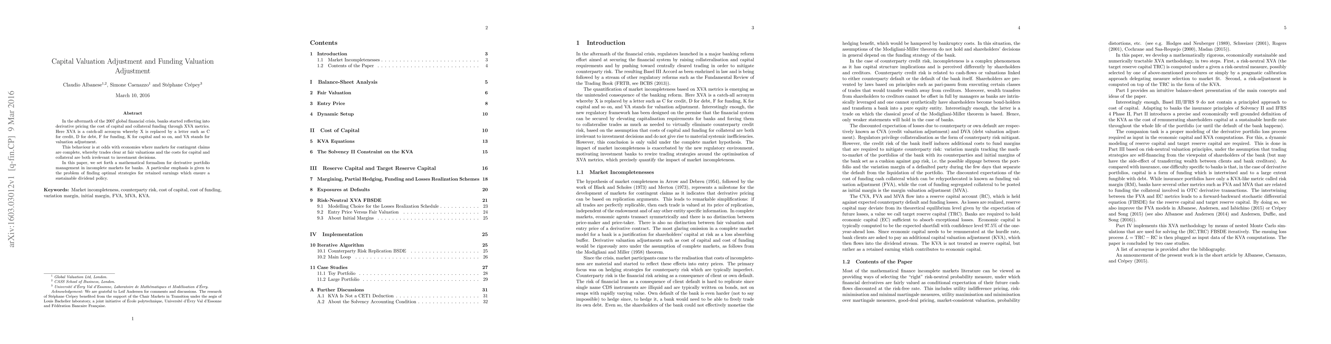 The paper presents a formal mathematical treatment of XVA metrics, including Capital Valuation Adjustment and Funding Valuation Adjustment, under incomplete markets, providing explicit solutions and conditions for well-posedness.
