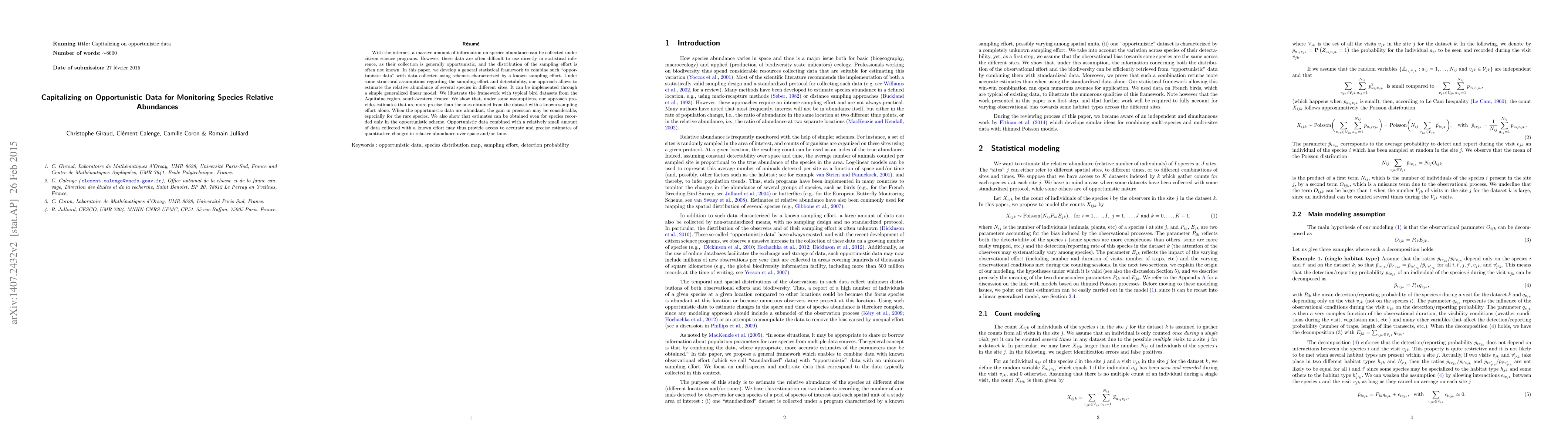 This paper develops a statistical framework to integrate opportunistic citizen science data with structured data to estimate species relative abundances, showing improved precision, especially for rare species, when opportunistic data are abundant. The approach is demonstrated using bird datasets from France.