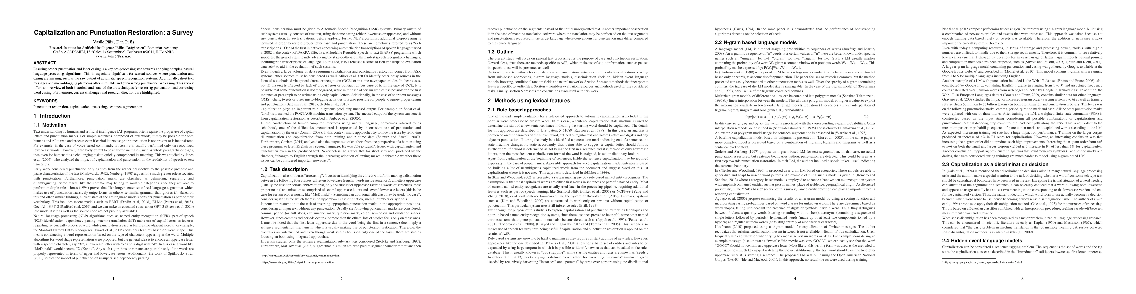 This survey reviews historical and modern methods for restoring punctuation and correcting word casing in text, emphasizing their importance for natural language processing, and highlights current challenges and future research directions.